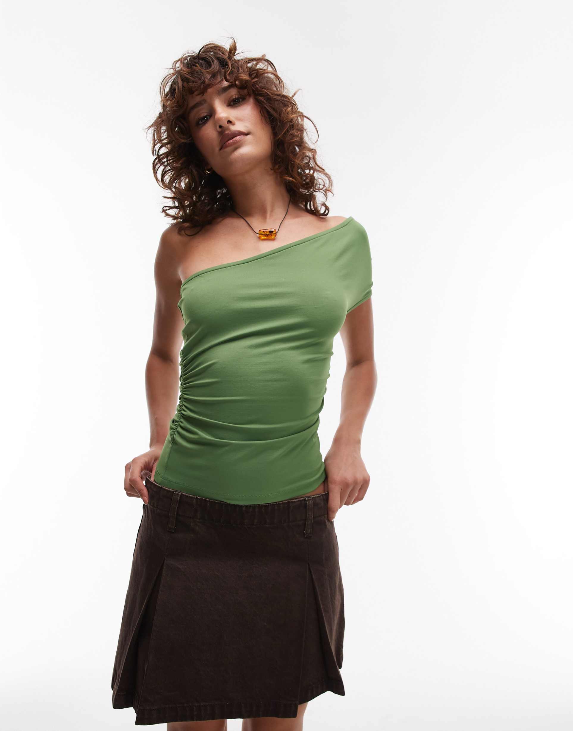 TOPSHOP ASYMMETRIC RUCHED ONE SHOULDER TOP IN GREEN