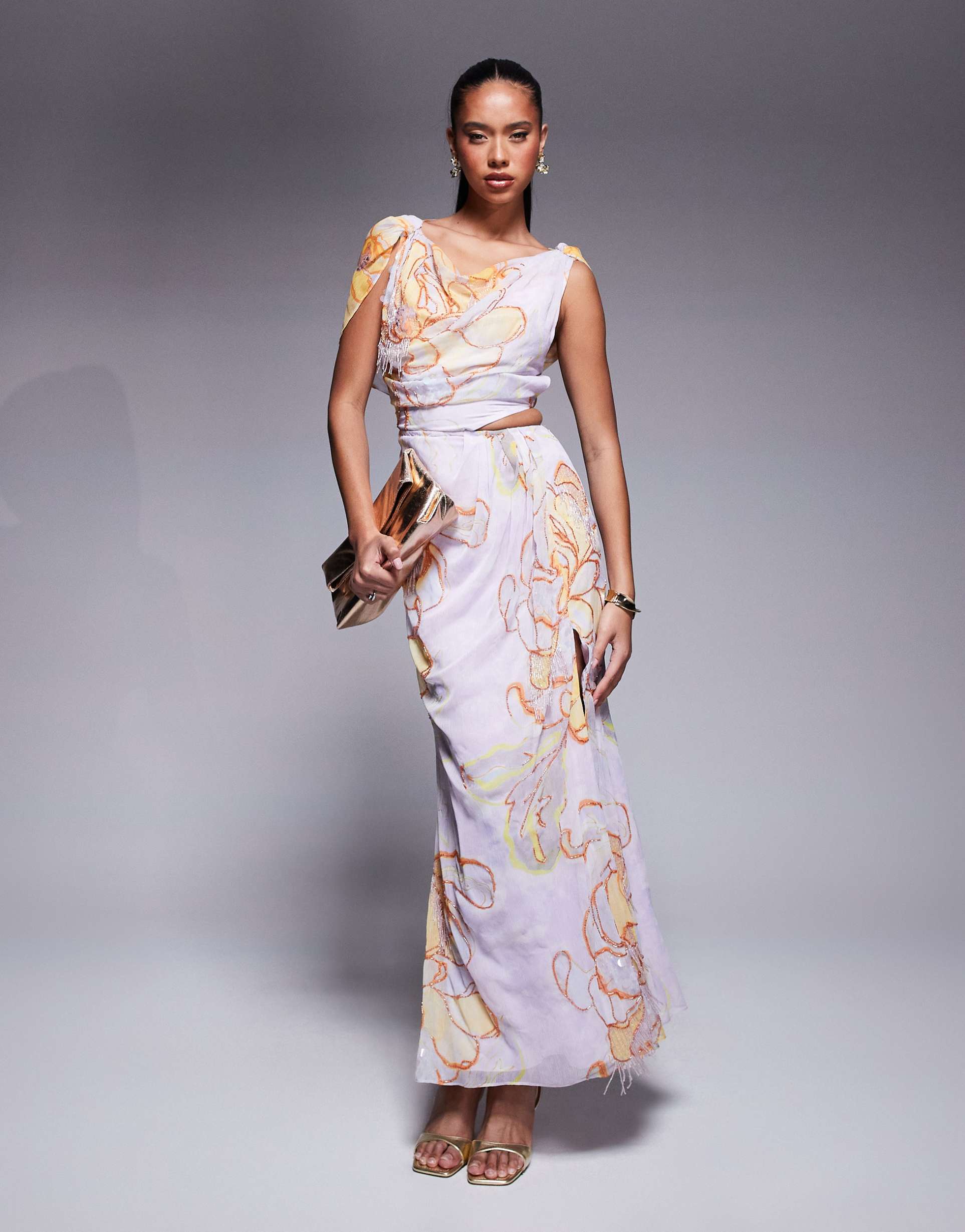 Soft chiffon fabric and a flattering midi length combine to create a sophisticated shift dress with an elegant cowl neck and sleeveless wide straps. The floral print in beige tones contrasts beautifully against the matte blue base, enhanced by delicate bead and sequin embellishments on the front and draped back. A side slit adds a touch of allure while maintaining a regular fit for comfort. Ideal for cocktail parties, date nights, or formal events in spring and summer, this dress balances refined style with effortless grace.