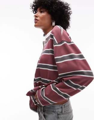 TOPSHOP JERSEY STRIPE RUGBY LONG SLEEVE POLO IN BURGUNDY