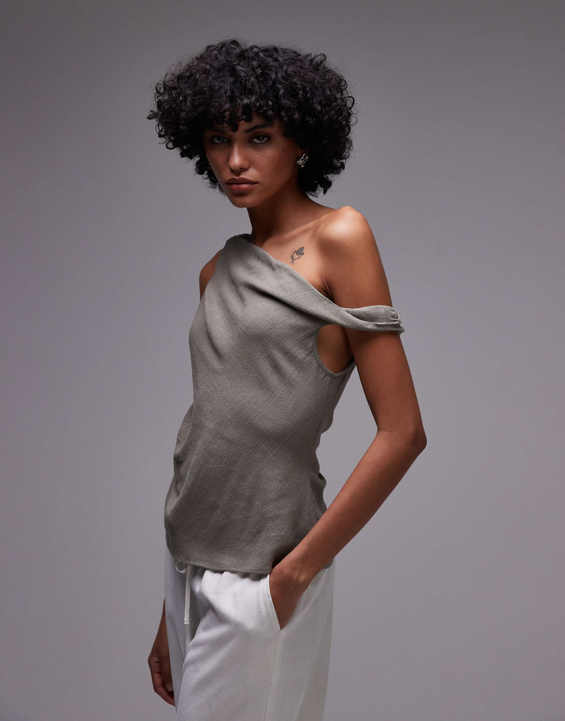The matte olive tone and soft blend of viscose and linen create a relaxed yet polished appeal in this asymmetric neck tank top. Featuring a distinctive twisted shoulder design and sleeveless styling, it offers a regular fit with hip length perfect for layering or standalone wear. Ideal for casual outings, brunch dates, or everyday wear, this minimalist modern piece brings a subtle sophistication with its clean silhouette and unique neckline detail.
