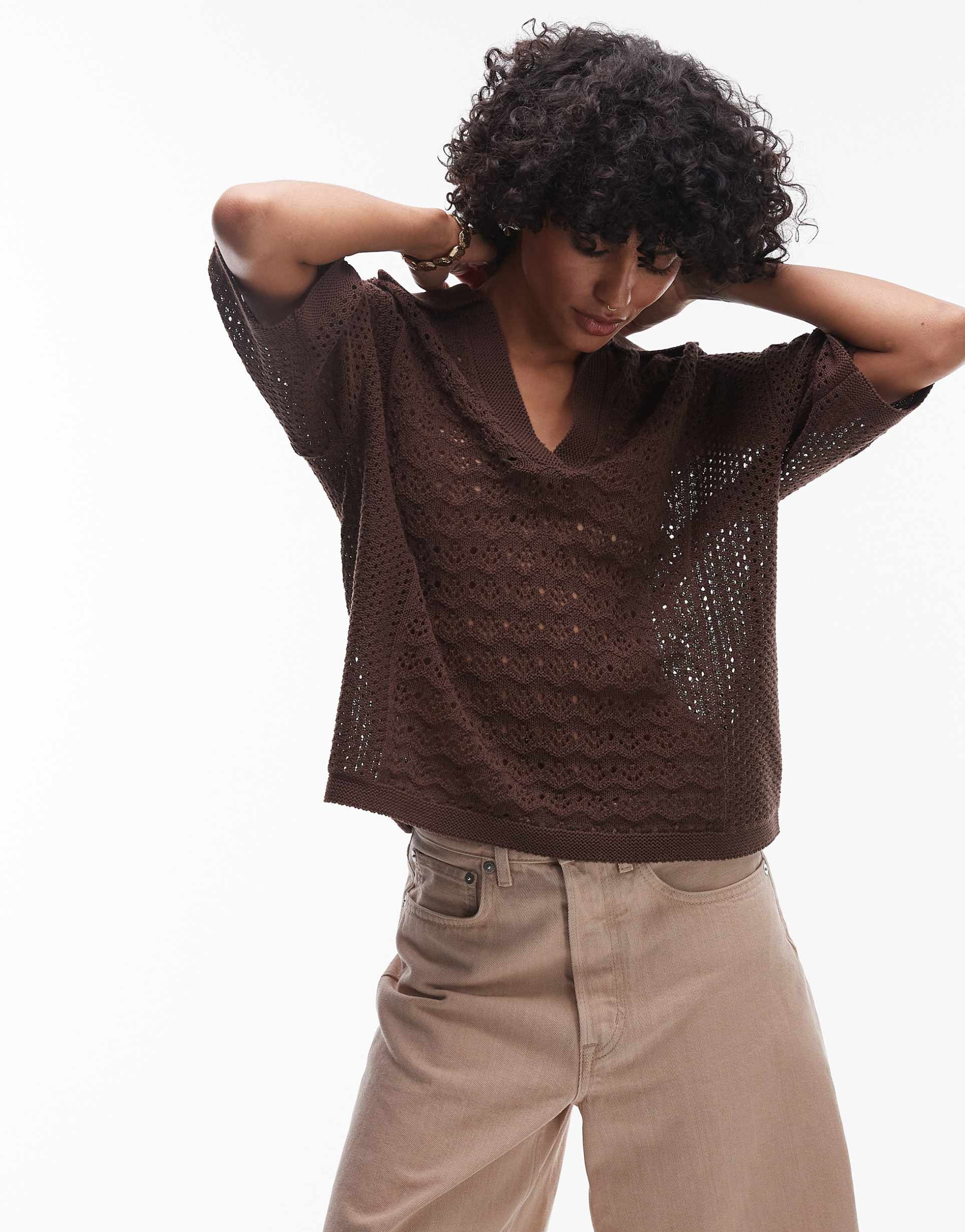 The Topshop open stitch polo top in a rich matte brown features a relaxed fit and half sleeves, perfect for everyday wear. Crafted from a soft cotton-acrylic knit blend with eyelet embroidery all over, this hip length top combines a classic V-neck and button placket for a minimalist casual chic vibe. Ideal for casual outings, brunch, or running errands, it blends breathable fabric with subtle design details to keep you comfortable and stylish through all seasons.