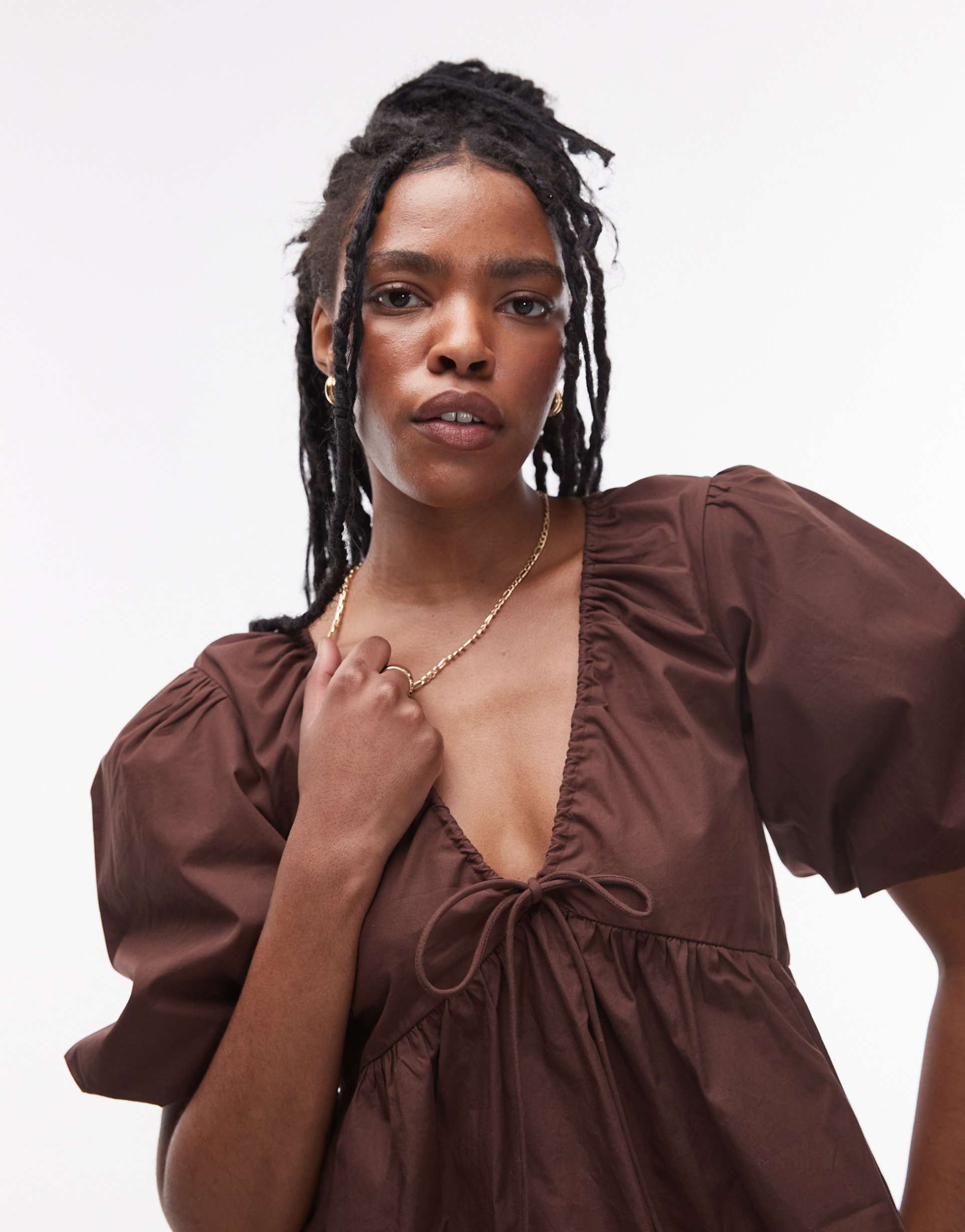 TOPSHOP POPLIN PUFF SLEEVE TOP IN CHOCOLATE
