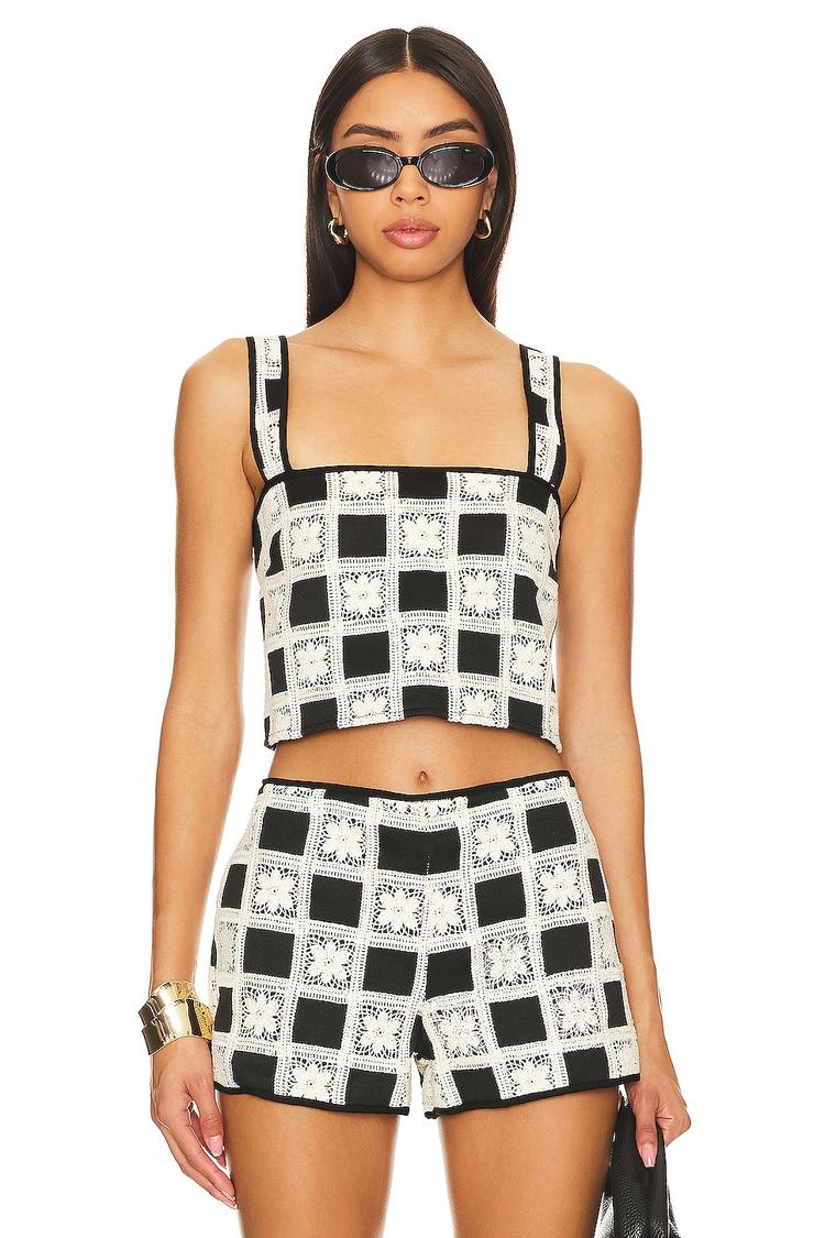 Crisp crochet knit fabric and a sleek square neckline define this cropped tank top in matte black and ivory color-blocked pattern. Designed with wide straps and a hidden back zipper, it offers a regular fit perfect for spring and summer days. Versatile for casual outings, brunches, and everyday wear, this Anna Top blends classic style with minimalist chic. The color-blocking enhances its sophisticated appeal while maintaining breathable comfort with its cotton-polyester blend.