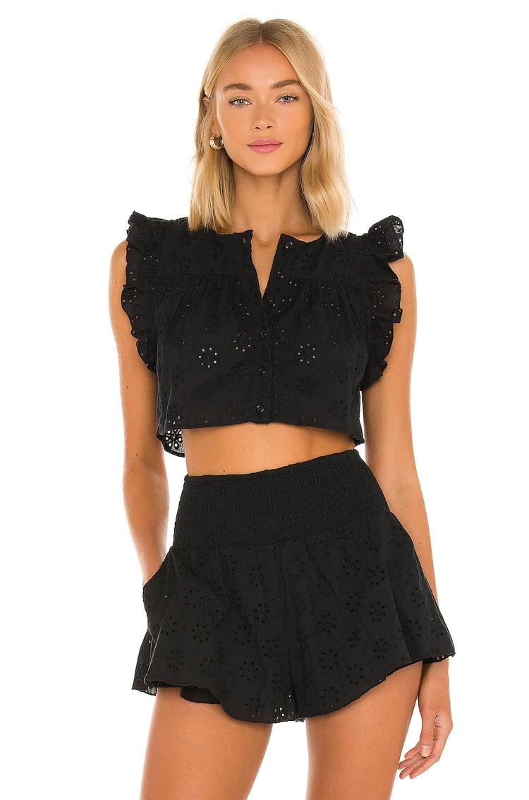 Delicate ruffle eyelet fabric and flutter sleeves shape this romantic cropped top in matte black cotton. Featuring a split neckline and front button closure, its regular fit and sleeveless design offer breathable comfort perfect for warm spring and summer days. This chic piece pairs effortlessly with high-waisted bottoms for casual outings, brunch dates, or relaxed evenings, embodying a bohemian spirit with refined detailing.