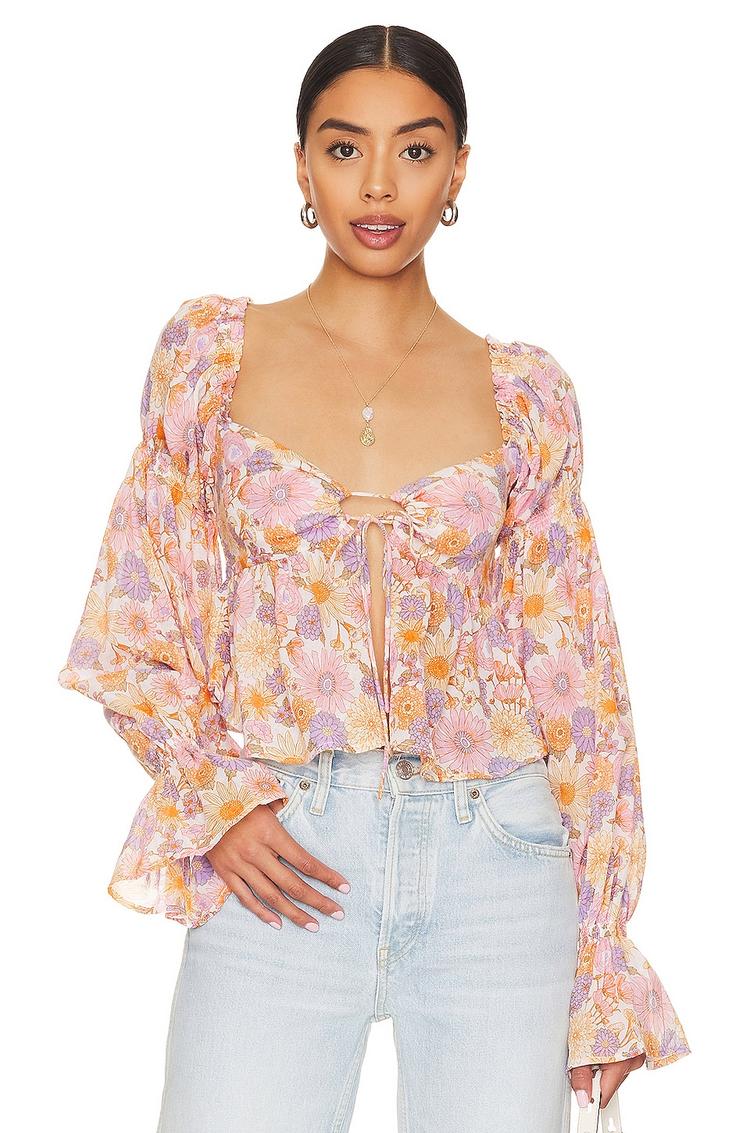 Soft, lightweight linen blend and relaxed fit define this romantic Blouson top with a square neckline and long bell sleeves. The floral pattern in dusty pink, beige, orange, and lavender hues adds a bohemian charm, while the contour bust features cut-out and tie details for a flattering silhouette. Its waist length and back tie closure make it perfect for casual outings, brunches, or date nights during spring and summer. The flared cuffs and airy fabric combine comfort and style effortlessly.