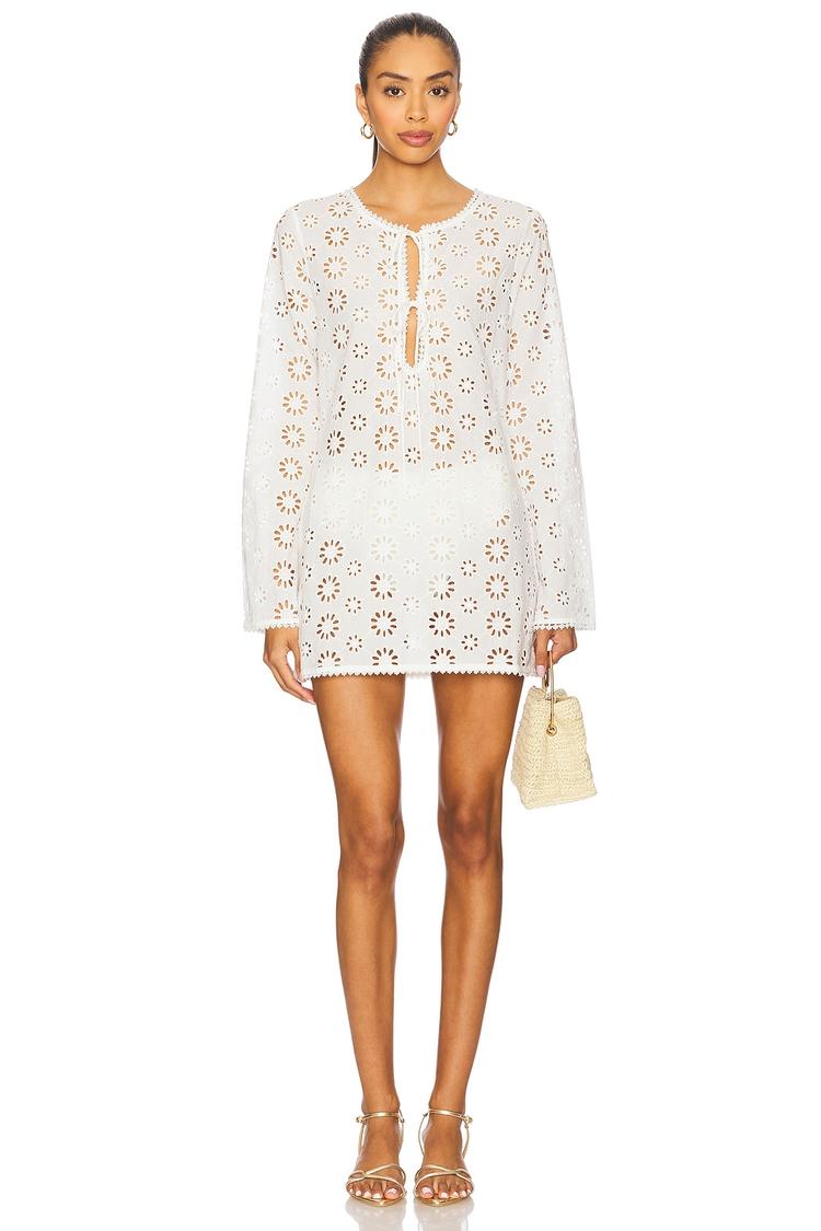 Delicate eyelet embroidery adorns this lightweight white cotton tunic, offering a breezy and relaxed fit perfect for warmer seasons. The round neckline is complemented by a dual tie-up closure, adding subtle detail to the clean silhouette. Its thigh-length hem and long sleeves balance coverage and airiness, making it ideal for casual outings, beach days, or vacation wear. Effortlessly chic and comfortable, this bohemian-inspired piece elevates everyday style with its timeless craftsmanship and breathable fabric.