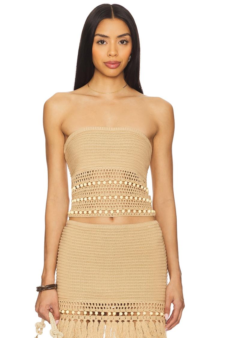Midweight knit fabric and beaded embellishments bring a refined bohemian vibe to this strapless cropped top in a matte beige hue. The slim fit contours the body with a sleeveless, pullover design that showcases a covered back and delicate beadwork concentrated on the bodice. Ideal for warm spring and summer days, this versatile top complements casual outings, brunch gatherings, and vibrant night out settings with effortless chic style.