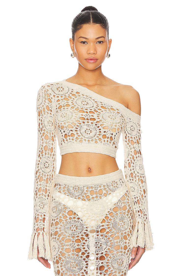 Delicate crochet fabric and an asymmetric neckline define this off-white cropped top, featuring long flounce sleeves with dramatic tassel cuffs. The slim fit silhouette enhances a chic, bohemian vibe perfect for spring and summer occasions like brunch, casual outings, or a night out. Crafted mainly from cotton with a touch of nylon, its sheer design offers a trendy layered look while maintaining comfort. This pullover style piece adds effortless flair to your wardrobe, ideal for girls' nights or date nights with its unique open crochet texture and standout sleeve details.