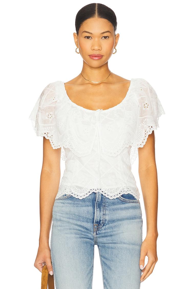 Delicate eyelet embroidery and flutter sleeves define this Romantic-style blouson top in crisp white. Crafted from a smooth lyocell-viscose blend, it features a flattering scoop neckline, ruffled hem, and a hidden side zipper for a clean silhouette. Its regular fit and waist length make it perfect for casual outings, brunch dates, or polished workwear looks during spring and summer. The soft fabric and feminine details create an airy, elegant vibe that pairs effortlessly with denim or tailored trousers.