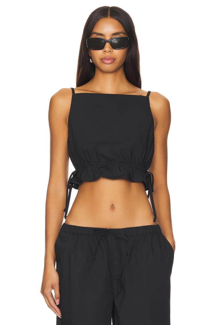 Lightweight cotton with a hint of elastane and viscose brings comfort and slight stretch to this slim-fitting, cropped camisole. Featuring a modern square neckline and delicate spaghetti straps, the Tanya Top is finished with subtle tie-up ribbon details at the sides that accentuate the waist. Its minimalist black solid design makes it an ideal choice for casual days, brunch outings, or date nights during spring and summer. The covered back and sleeveless style enhance its breezy, chic vibe while pairing effortlessly with high-waisted bottoms.