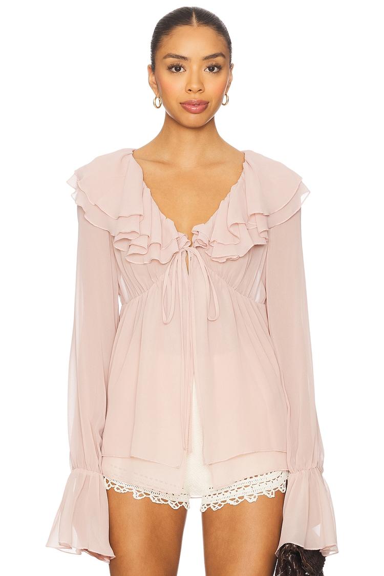Softly flowing in a dusty rose hue, this blouson top crafted from midweight crepe polyester features a romantic tiered collar with delicate ruffles that extend across the front and flare at the long sleeves. The loose fit and open front with self-tie closures create an airy silhouette ideal for layering. Semi-sheer fabric adds a subtle allure, perfect for casual outings, brunch dates, or relaxed evenings. Its hip-length hem and flounce sleeves contribute to a bohemian chic vibe, blending feminine details with versatile wearability across spring, autumn, and all-weather occasions.