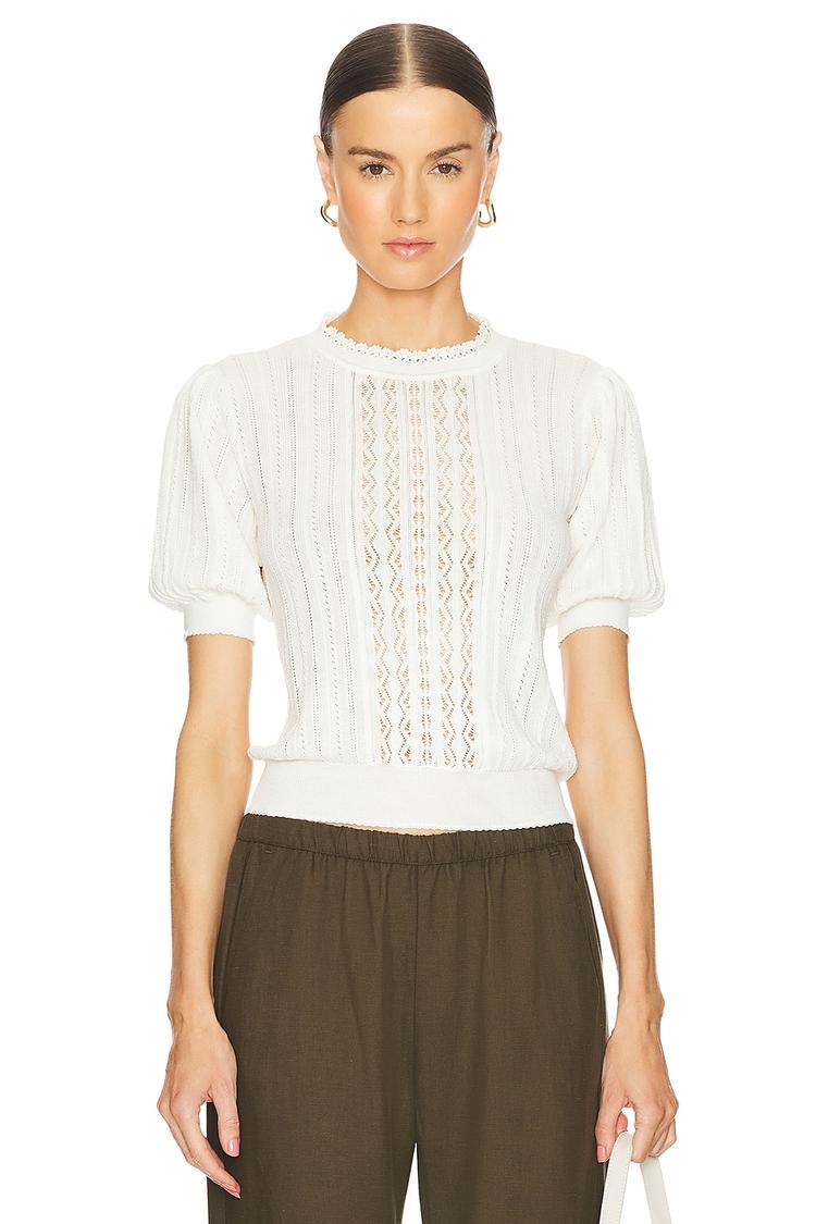 Delicate crochet knit fabric in a matte white hue defines this Gemma Shell top, featuring a regular fit and waist length hem for a flattering silhouette. The puffed half sleeves and classic crew neckline add a romantic and elegant touch, while subtle pleating enhances the front and sleeves. Crafted from a luxurious blend of silk and cotton, this pullover top is perfect for casual outings, brunches, and business casual settings, offering breathability and sophistication across spring, summer, and autumn seasons.