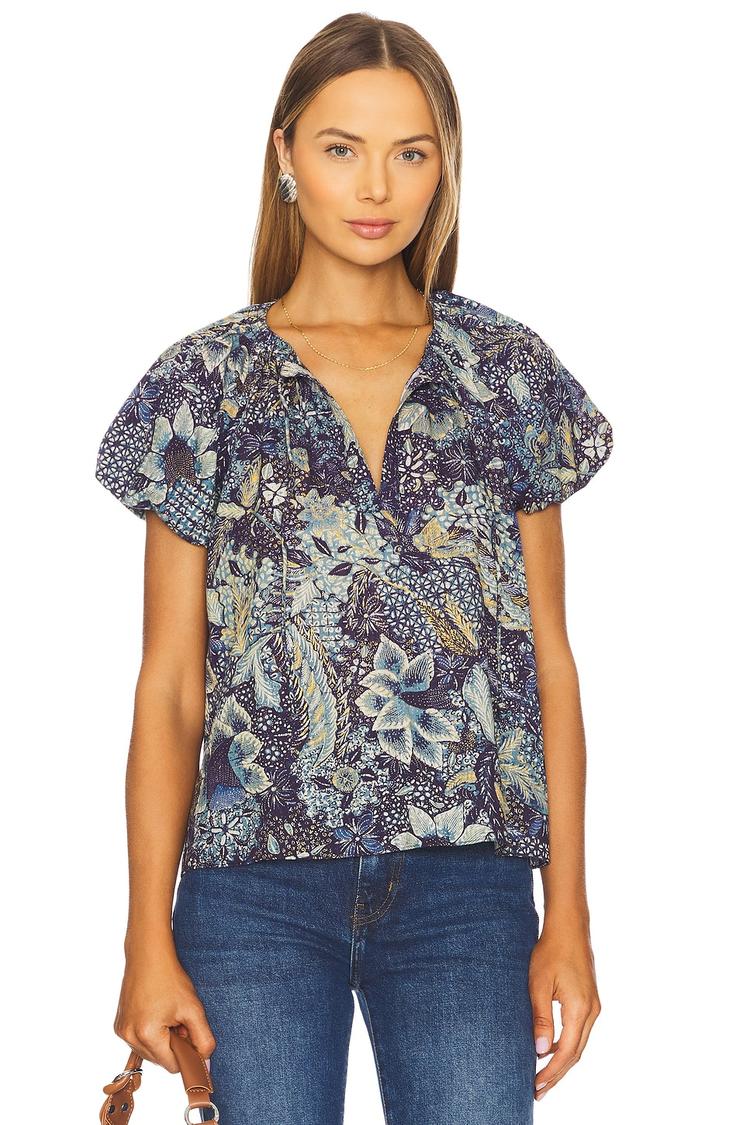 Soft, lightweight poplin fabric and a relaxed fit make this Issa Top an effortless choice for warm days. The hip-length shell top features a flattering V-neck with a front self-tie closure and airy balloon half sleeves with elastic cuffs, adding subtle volume and comfort. Its all-over muted floral and abstract print in dark blue tones brings a bohemian yet casual chic vibe. Ideal for casual outings, brunches, or workwear, this versatile top blends breathable cotton and viscose for easy wear and style.
