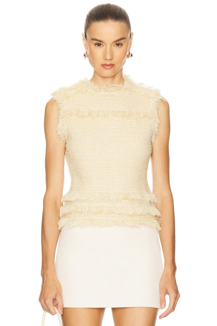 Soft cream tweed with a midweight texture brings refined elegance to this sleeveless shell top. Featuring a fitted silhouette with a high neckline and delicate all-over frayed fringe detailing, it pairs perfectly with skirts or tailored pants. Ideal for spring and autumn, this sophisticated piece transitions seamlessly from business casual settings to brunch dates and casual workwear. The pullover style and classic cut offer comfort and understated luxury, making it a versatile addition to a polished wardrobe.