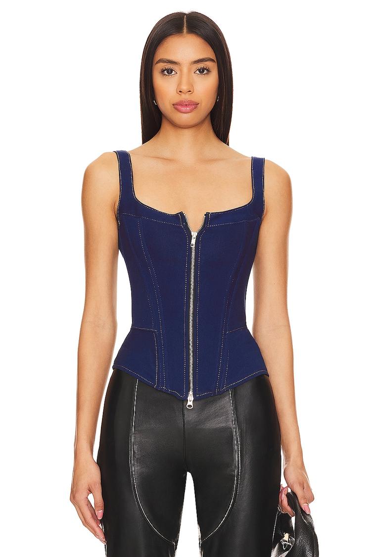 Structured with a boned bodice and framed by wide straps, this fitted waist-length corset top in matte dark blue denim elevates edgy modern style. The square neckline and front zipper closure enhance its sleek silhouette, while the frayed trim adds subtle texture and attitude. Lightweight cotton-elastane fabric ensures comfort and versatility for all-weather wear. Ideal for casual outings, nights out, or brunch with friends, this piece pairs effortlessly with leather pants or denim for a confident, fashion-forward look.