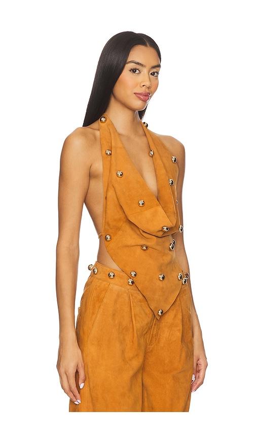 UNDERSTATED LEATHER DOME STUDDED HALTER TOP IN BROWN.