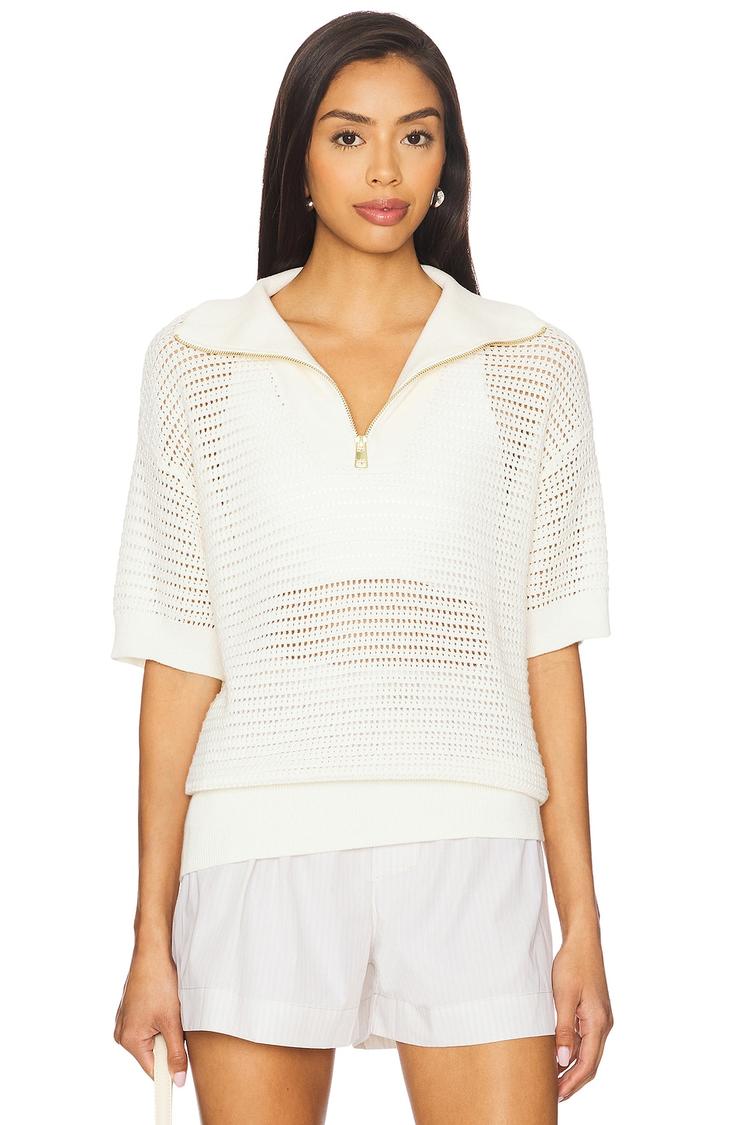 Midweight open knit cotton fabric crafts this relaxed-fit shell top in a versatile off-white hue. Featuring a hip-length hem and half sleeves, it showcases a V-neckline with a functional half zipper closure for adjustable style and comfort. The sheer knit texture adds a delicate, airy feel perfect for layering or warm-weather wear. Ideal for casual outings, loungewear, and travel, this minimalist piece blends comfort with effortless chic for everyday versatility.