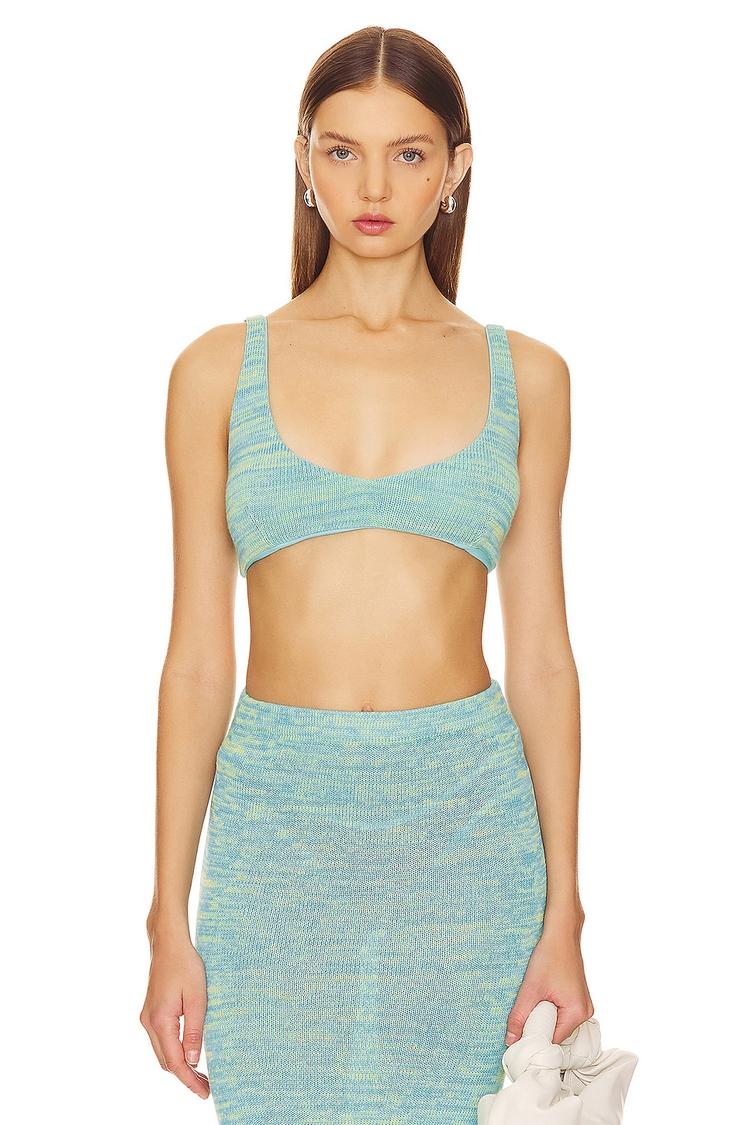 Soft knit fabric and a fitted silhouette define this bralette with a flattering U-neck and wide straps for support. The cropped length and adjustable shoulder straps enhance comfort and versatility, while the back tie closure adds a delicate, customizable detail. Its matte light blue shade evokes a fresh, minimalist vibe perfect for spring and summer days. Ideal for casual outings, beach trips, or vacation wear, this bralette pairs effortlessly with high-waisted bottoms or layered looks, offering both style and ease for warm-weather occasions.