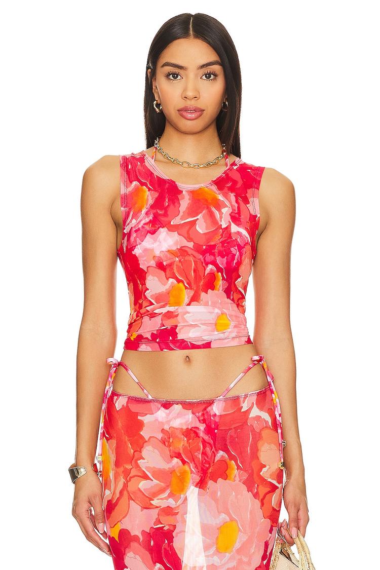 Vibrant floral mesh fabric in bright red, pink, orange, and yellow hues defines this fitted tank with a classic round neckline and sleeveless styling. The waist-length silhouette with a covered back offers a trendy yet casual look perfect for summer and spring outings. Designed with breathable nylon and elastane blend, this semi-sheer top is ideal for streetwear, beach days, and vacation vibes, combining comfort and style with a playful bohemian spirit.