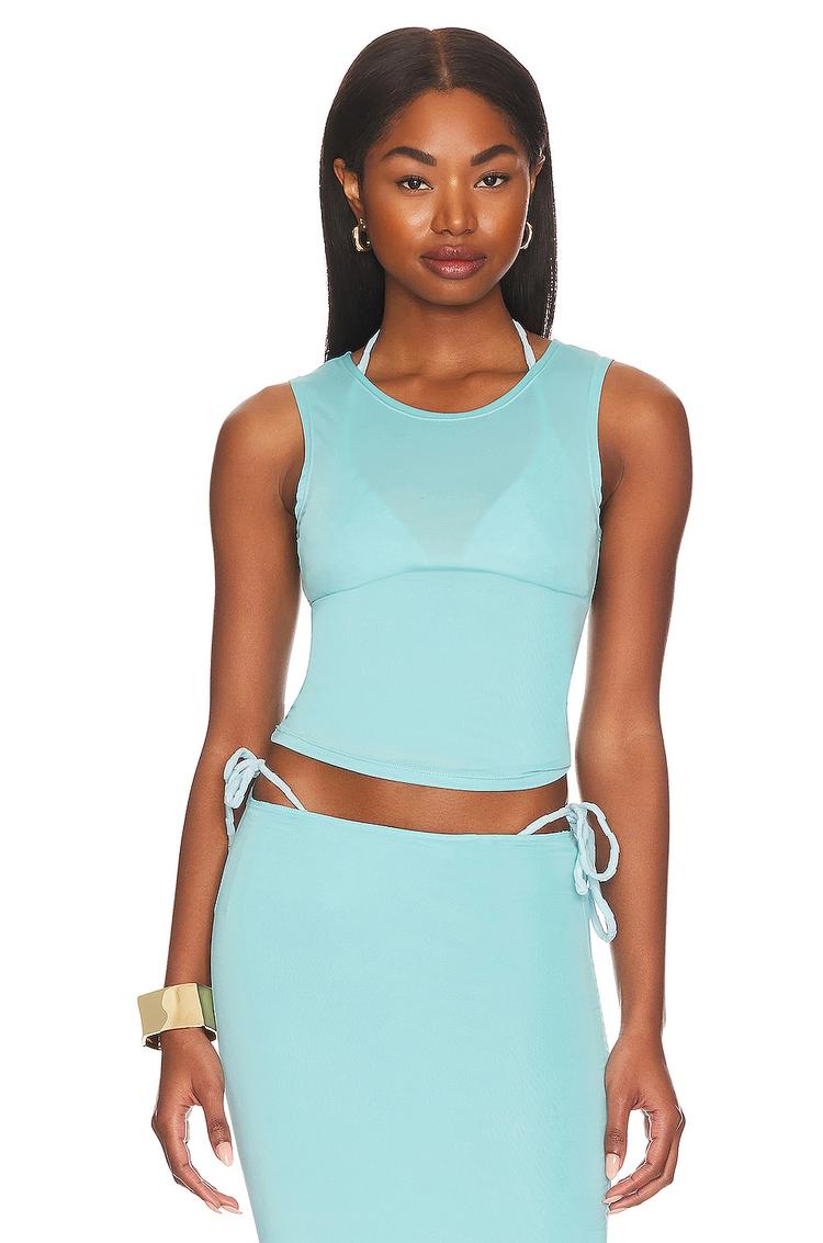 Effortless and airy, the Charlotte Tank in powdery blue brings sunshine to any day. Crafted from lightweight slinky jersey (78% nylon, 22% spandex), it drapes with soft stretch and a breathable feel. The sleeveless, high-crew neckline creates a sleek cropped silhouette that flatters high-waisted bottoms. An open back with a slim strap detail adds subtle edge for evening looks. Pair with a white pencil skirt for brunch, denim for casual chic, or layer under a blazer for work-appropriate style. Minimal yet versatile, this top is a go-to staple that looks as good as it feels.