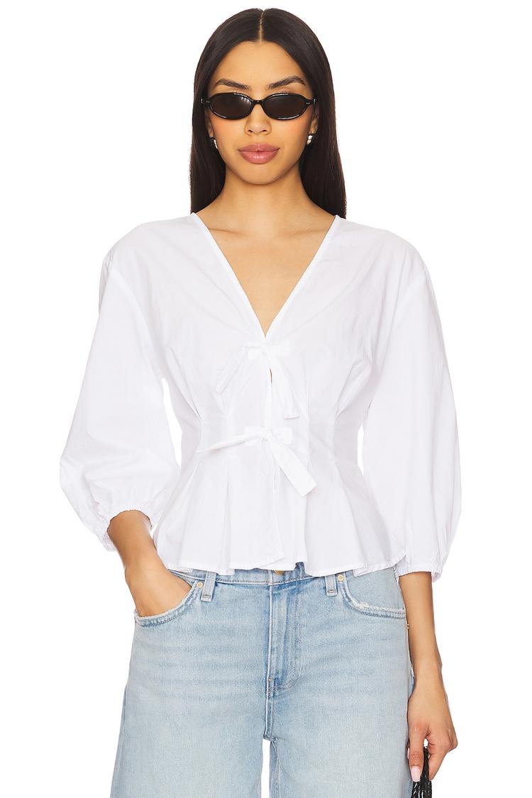Crisp white cotton with a midweight poplin texture brings a clean, classic feel to this wrap top. Featuring a flattering V-neck and three-quarter regular sleeves with elastic cuffs, it offers a relaxed fit perfect for everyday elegance. The pleated design adds subtle sophistication while the dual front tie closures provide adjustable comfort. Hip-length and versatile, this minimalist piece transitions effortlessly from casual brunches to workwear settings and laid-back spring or autumn days.