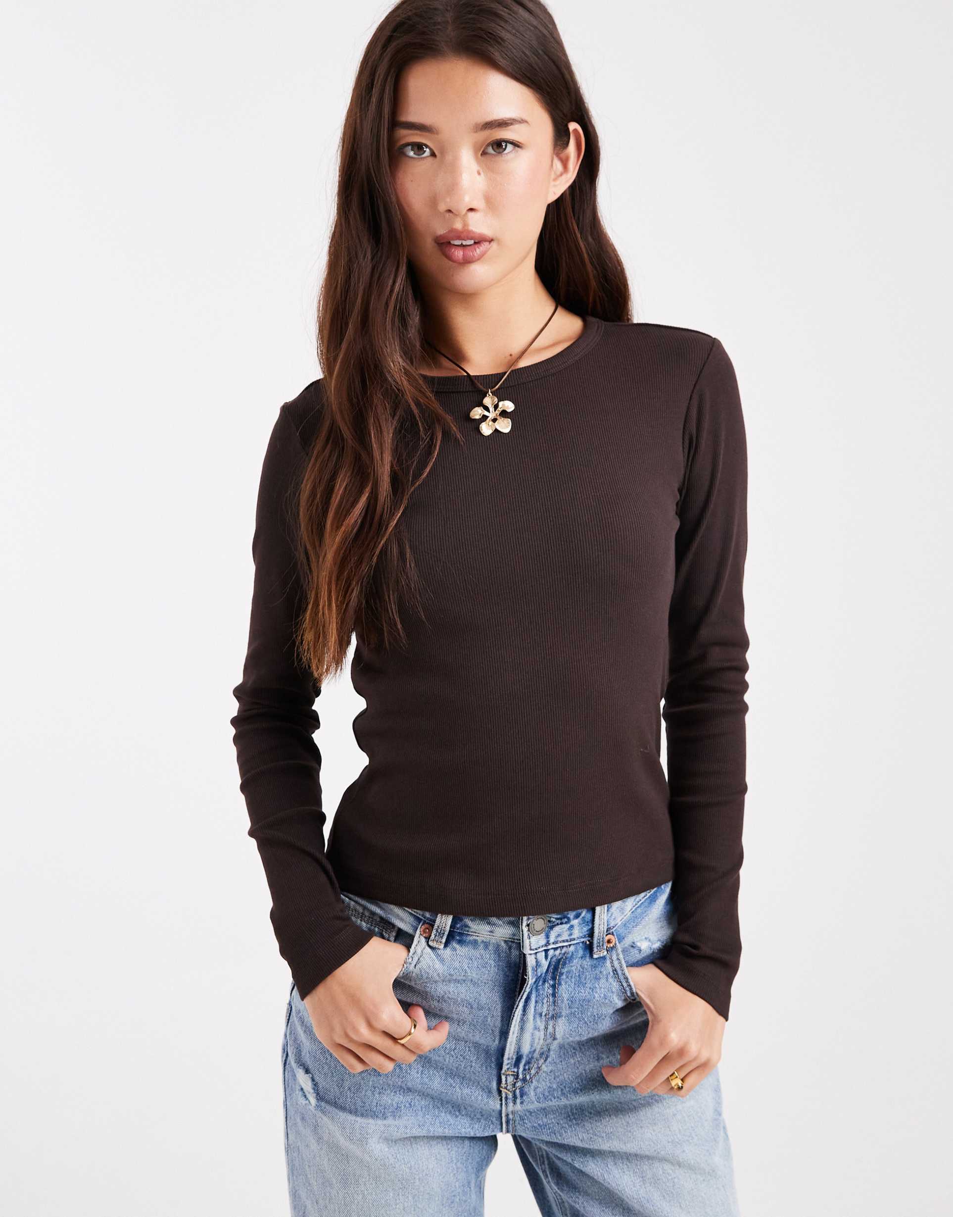 VERO MODA LONG SLEEVE BABY RIBBED TOP IN BROWN