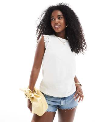 VERO MODA SLEEVELESS JERSEY TOP WITH BRODERIE TRIM IN WHITE