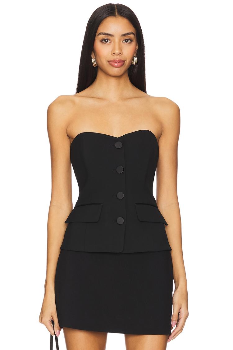 Structured with a boned bodice and classic sweetheart neckline, this black corset top delivers a fitted silhouette that flatters the figure. Crafted from a midweight blend of polyester, viscose, cotton, and elastane, it offers both comfort and shape retention. The strapless design and front button closure enhance its chic, sophisticated vibe, while faux flap pockets add subtle detailing. Ideal for cocktail evenings, date nights, and stylish night outs, this hip-length piece embodies timeless elegance with a modern edge.