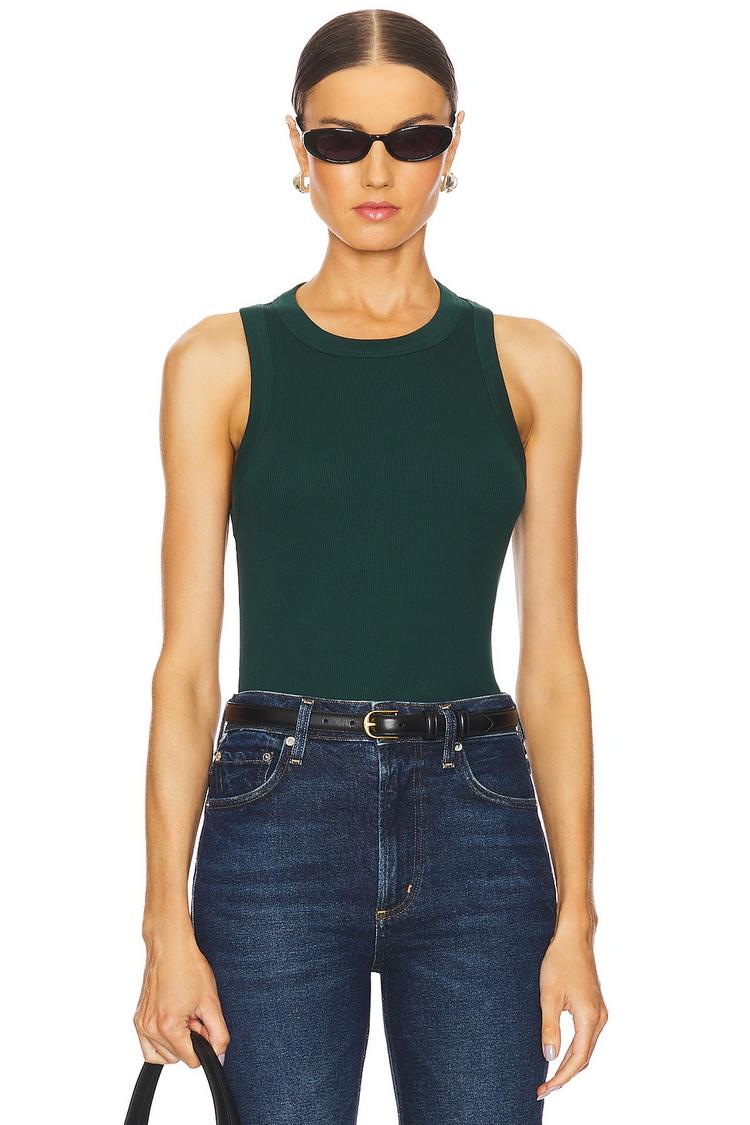 Crisp pima cotton blended with elastane shapes this fitted cropped tank in a rich dark green hue. Featuring a classic crew neck and wide straps, this sleeveless piece offers clean lines and a minimalist silhouette. Its pullover styling ensures easy wear, making it a versatile staple for spring and summer. Ideal for casual outings, brunch dates, or everyday layering, this tank delivers comfort and understated style with a modern casual chic edge.