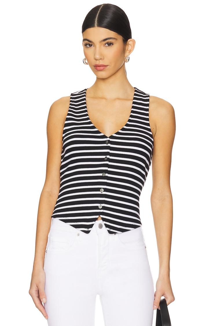 Ribbed jersey fabric and a tailored fit define this sleeveless tank top, featuring a classic black and white striped pattern. With a flattering V-neckline and front button closure, it offers a timeless silhouette that hits at the waist length. Crafted from a soft blend of pima cotton and elastane, it promises comfort and stretch for everyday wear. Ideal for casual outings, brunch dates, or spring and summer days, this minimalist piece pairs effortlessly with white denim or layered under jackets for a versatile wardrobe staple.