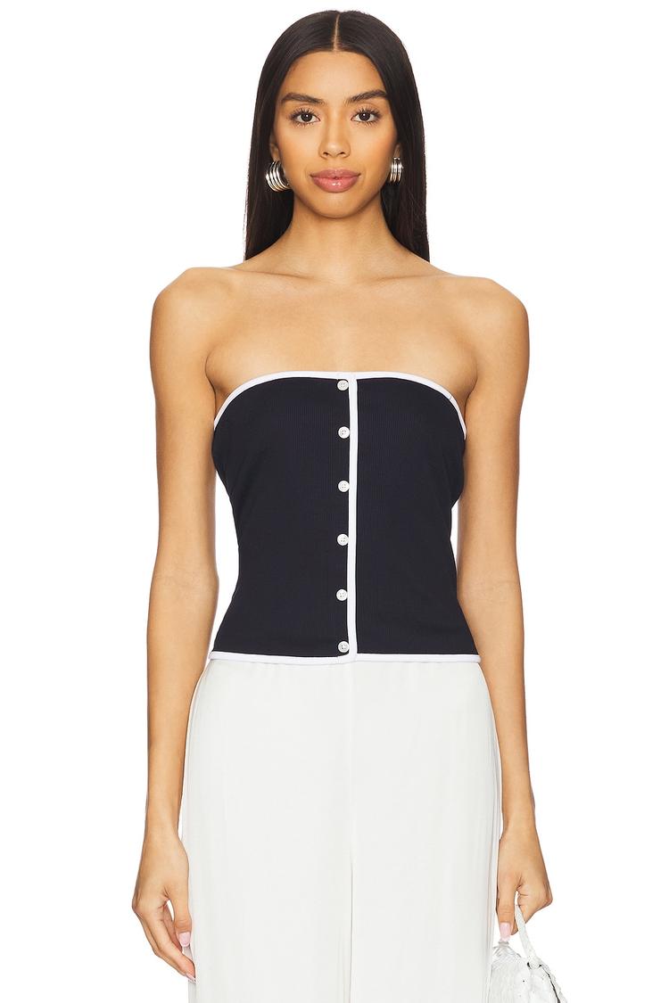 A sleek strapless bandeau shell in matte black ribbed jersey with contrasting matte white faux button detailing down the front. This fitted waist-length top offers a minimalist, modern silhouette with pullover styling, crafted from a comfortable cotton-elastane blend. Ideal for warm-weather occasions like casual outings, brunch dates, or night outs, its clean lines and lightweight fabric make it a chic, versatile wardrobe staple.