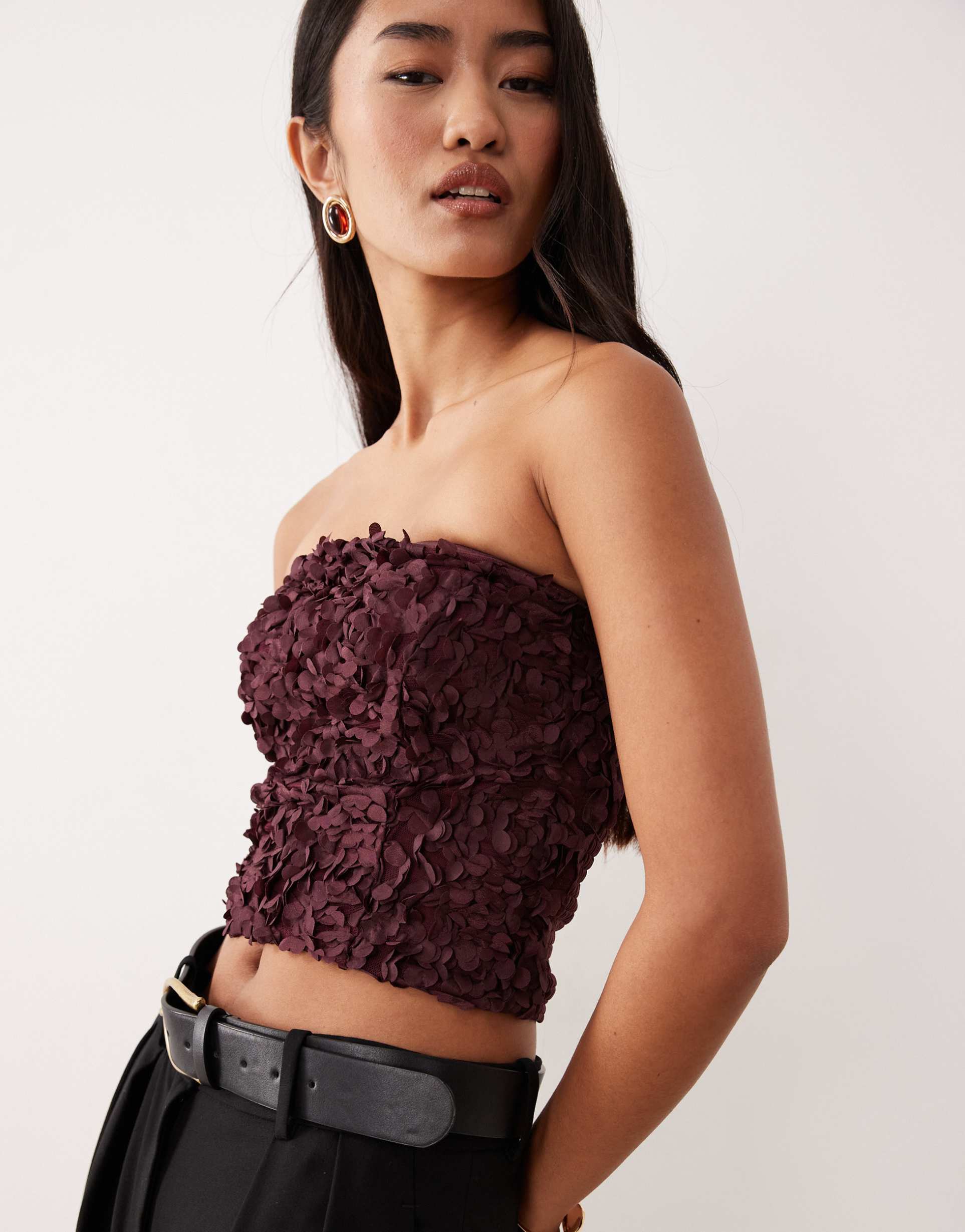 Rich burgundy polyester with 3D rose appliques creates a textured, romantic bandeau top. The strapless neckline and sleeveless style highlight the slim fit silhouette and cropped length, perfect for warm spring and summer nights. Featuring a shirred stretch back panel for comfort and ease, this elegant and chic piece is ideal for casual outings, date nights, or a night out with friends. The all-over applique detailing adds a unique touch of sophistication to elevate your look effortlessly.