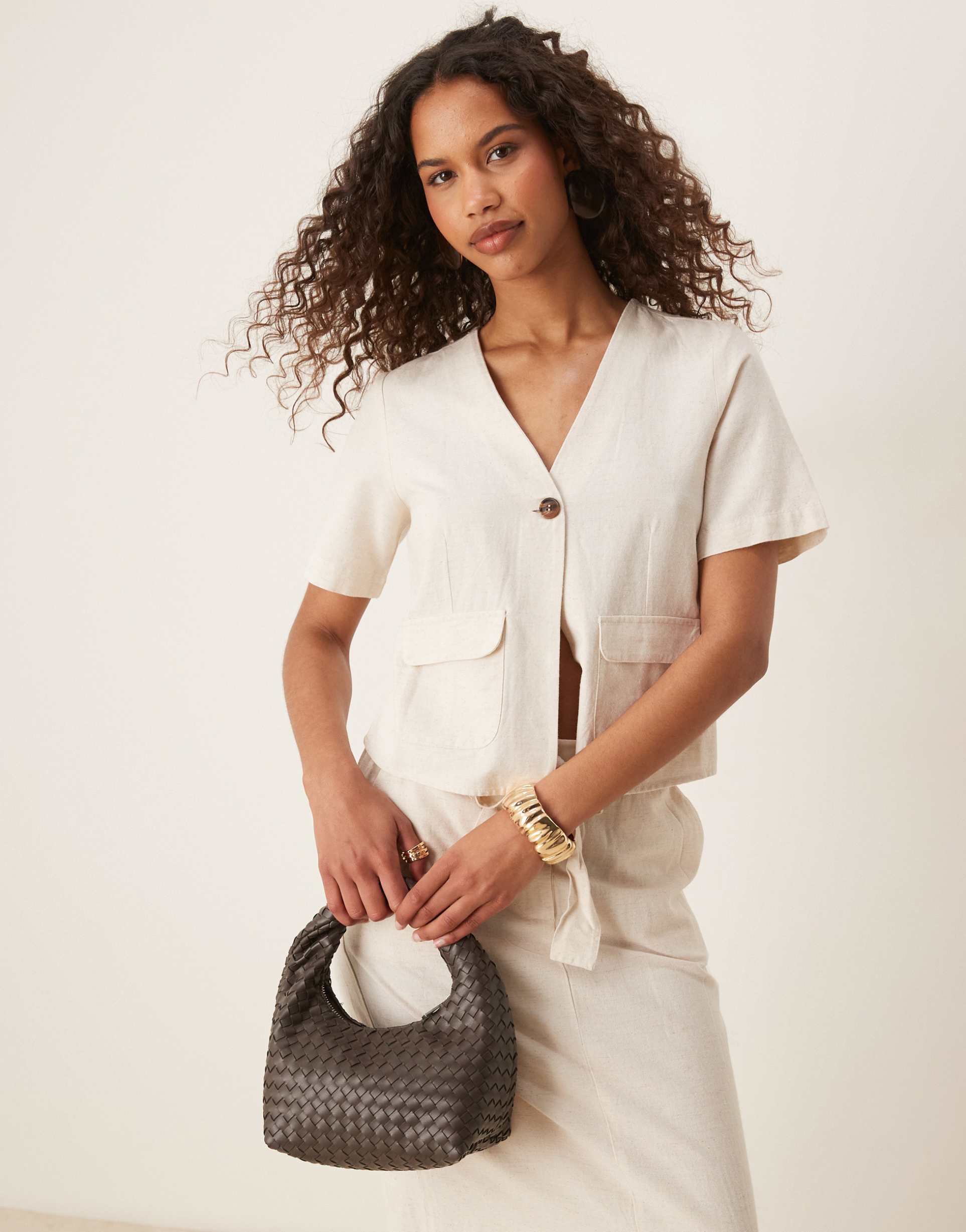VILA LINEN TOUCH SHORT SLEEVE BUTTON FRONT TOP IN HEATHERED CREAM - PART OF A SET