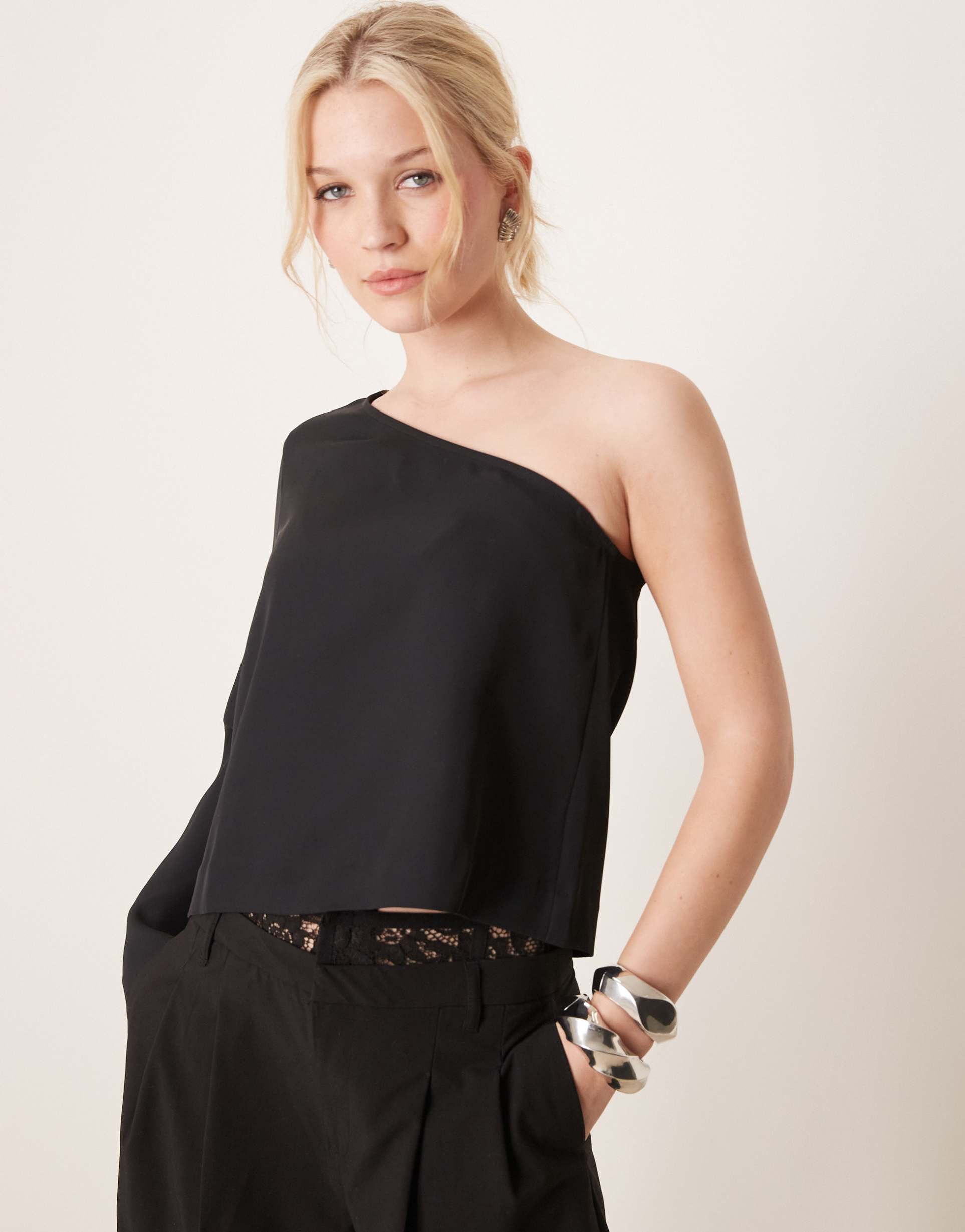 Sophisticated and sleek, this black asymmetric one-shoulder top features a regular fit and sleeveless design that highlights an elegant neckline. Crafted from a plain-woven polyester and polyamide blend, it offers a smooth texture and comfortable wear. The hip-length silhouette and covered back make it a versatile piece, perfect for date nights, casual outings, or a night out with friends. Its minimalist style pairs effortlessly with various looks, bringing a chic, modern edge to any wardrobe.