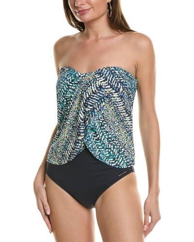 Feel the sun-drenched breeze in this Vince Camuto printed drapey tankini top. A strapless bandeau silhouette pairs with a chic blue snake-spot print, lined for a smooth silhouette and molded cups for subtle shaping. Removable adjustable straps offer versatility, while the pullover design keeps styling effortless. The front-draped detail adds movement, making it flattering from every angle. Wear it solo with a high-waisted bottom for a poolside look, or mix with a coordinating set for resort-ready elegance. A stylish, flattering swim piece that transitions from beach to boardwalk with ease.