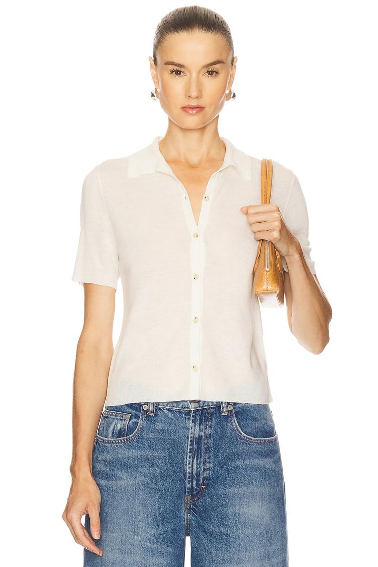 Soft and lightweight knit fabric blends wool, polyester, and cashmere in this classic collared shell top. Featuring a front button closure and ribbed trim along the collar, cuffs, and hem, this half-sleeve, waist-length top offers a regular fit that’s perfect for workwear, business casual, or casual brunch outings during autumn and spring. Its minimalistic design and elegant silhouette make it a versatile layering piece with a timeless appeal.