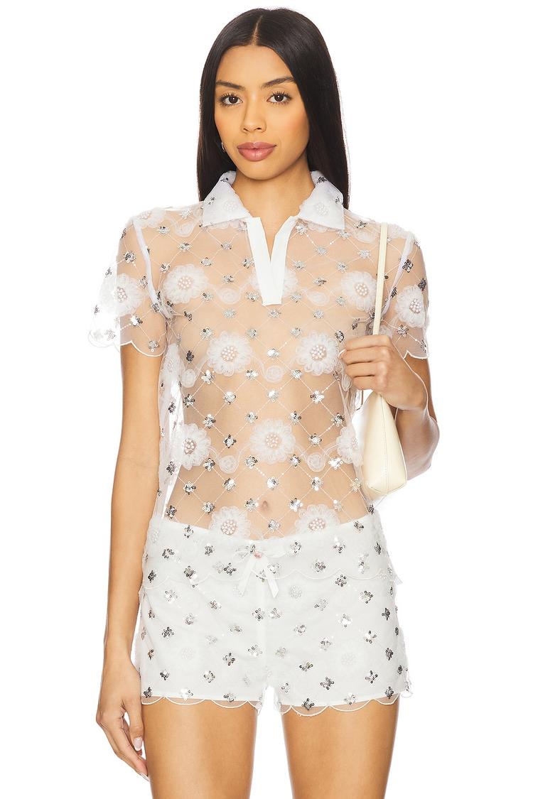 Lightweight sheer tulle fabric with intricate tonal 3D floral embroidery and delicate faux pearl accents bring a romantic elegance to this embroidered polo. Featuring a classic polo collar, half sleeves, and a scalloped hem, this hip-length regular fit top blends feminine charm with a modern silhouette. Perfect for spring and summer brunches, casual outings, or date nights, it pairs beautifully with your favorite bottoms for a chic, sophisticated look. The sheer design adds a subtle allure, making it a standout piece for refined yet playful styling.