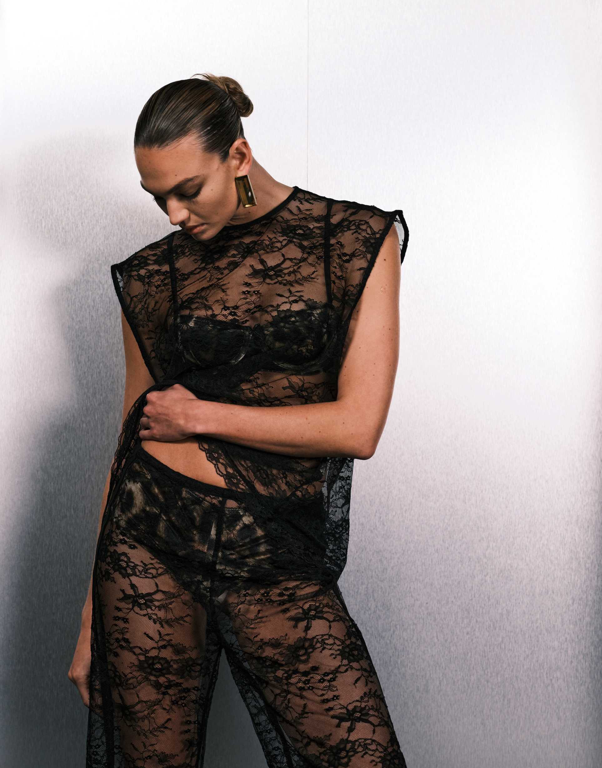 Delicate lace mesh and a matte black finish define this longline top with half sleeves and a classic round neckline. The button fastening at the back adds a subtle detail to its regular fit silhouette, making it an elegant yet sexy choice. Crafted from polyamide with intricate lace overlay, this versatile piece is perfect for casual outings, date nights, or stylish evening events. Its sheer texture and hip-length cut elevate your look with a modern edge and refined allure.