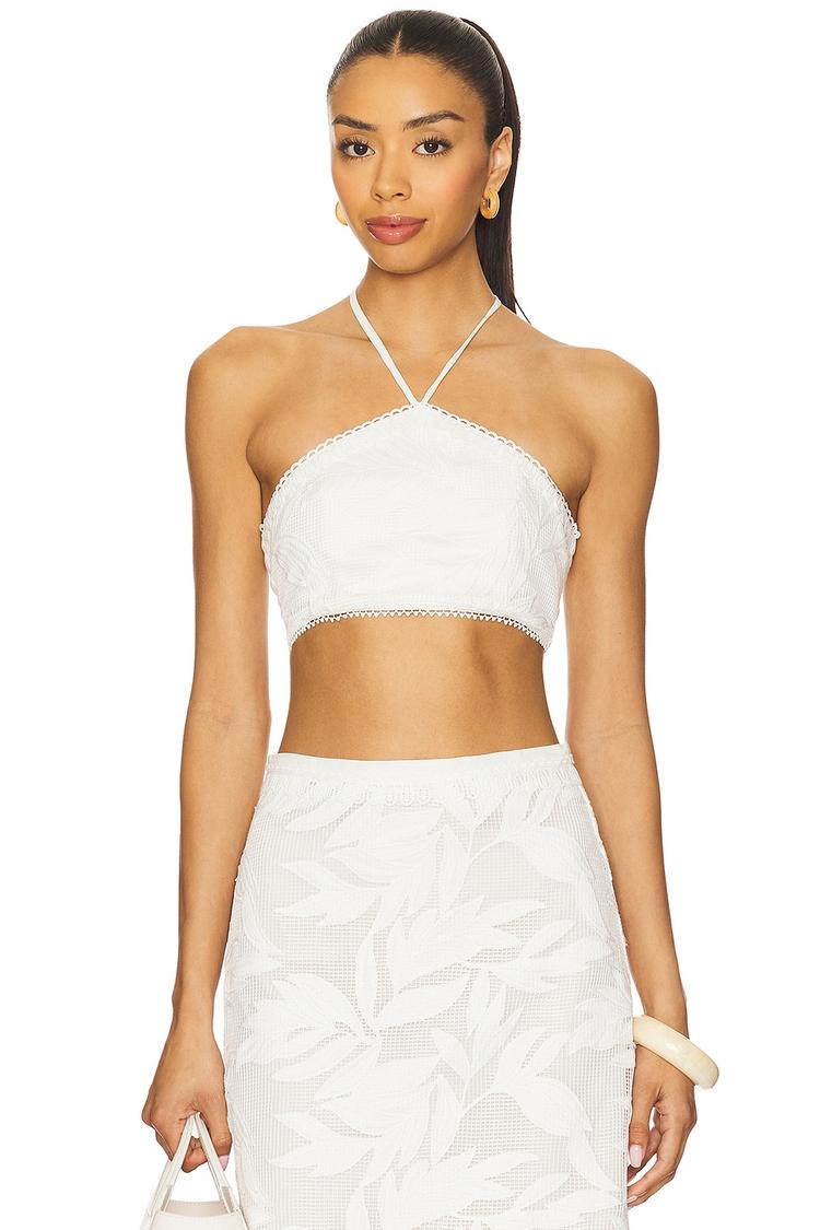Embody effortless summer style with this slim-fitting cropped halter top featuring delicate embroidered leaf details all over a midweight lace fabric. The tie-back closure adds a playful and adjustable touch, enhancing its bohemian and casual chic vibe. Perfect for beach days, brunch outings, or vacation wear, this white polyester top combines comfort with trendy appeal for warm weather occasions.