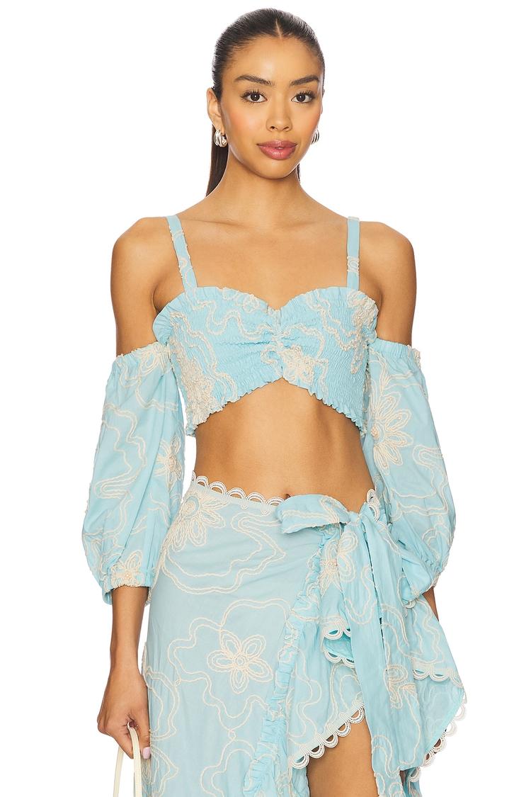 Soft light blue cotton with delicate off-white floral embroidery and a fitted smocked bodice define this romantic cropped top. The square neckline and three-quarter balloon sleeves add airy elegance, while the front ruched detail brings a flattering touch. Its pullover design offers easy wear, making it ideal for spring and summer days. Perfect for casual outings, brunch with friends, or a charming date night, this top blends bohemian allure with casual chic style effortlessly.