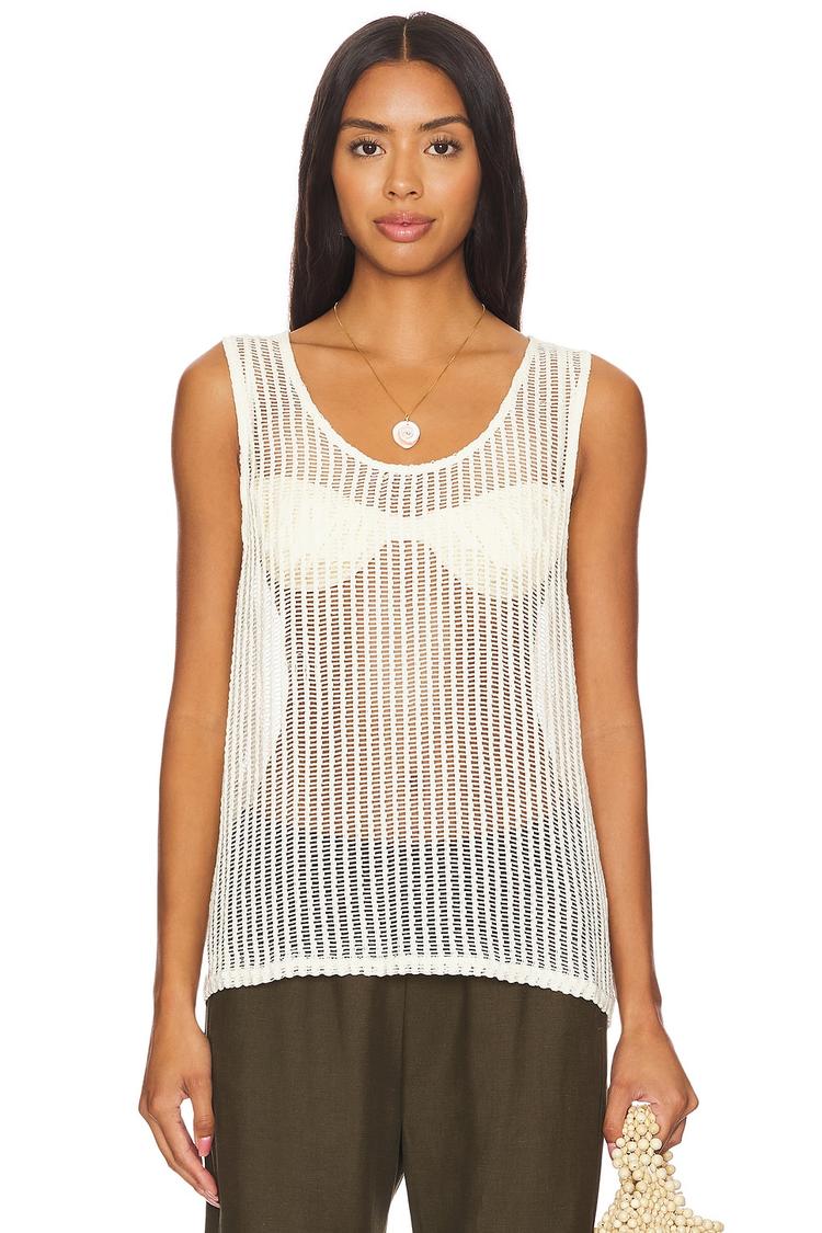 Lightweight open crochet knit and a relaxed loose fit make this off-white tank top an airy choice for warm days. Featuring wide straps and a classic round neckline, this hip-length piece pairs effortlessly with casual and vacation looks. Its sheer fabric and sleeveless design embrace the summer and spring seasons, offering breathable comfort and bohemian casual chic style. Ideal for brunch outings, beach vacations, or laid-back everyday wear, this polyester tank top invites layering with ease while elevating your warm-weather wardrobe.