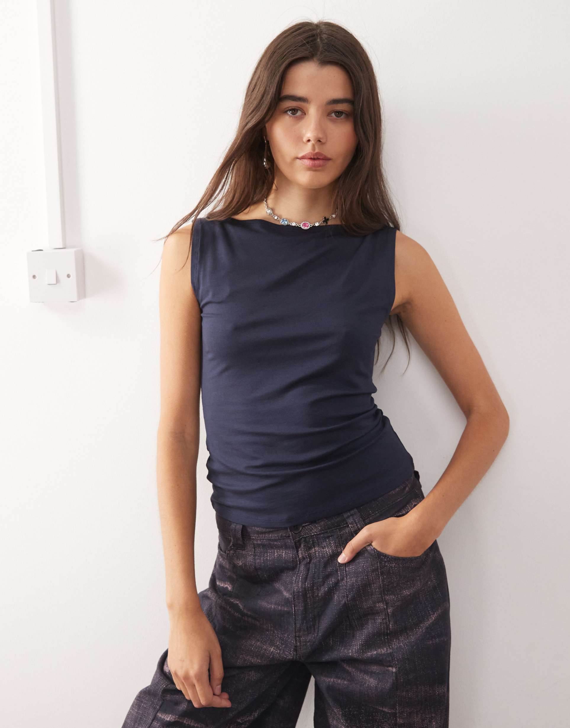 Soft and super comfortable, this dark navy tank top features a classic boat neck and a slim fit that flatters your silhouette. Crafted from a blend of lyocell and elastane, it offers gentle stretch and breathability, making it perfect for casual outings, everyday wear, and travel adventures. The sleeveless design and hip-length cut provide versatile styling options, whether layered or worn alone. Minimalist and casual chic in style, this top is a reliable wardrobe essential for warmer seasons.