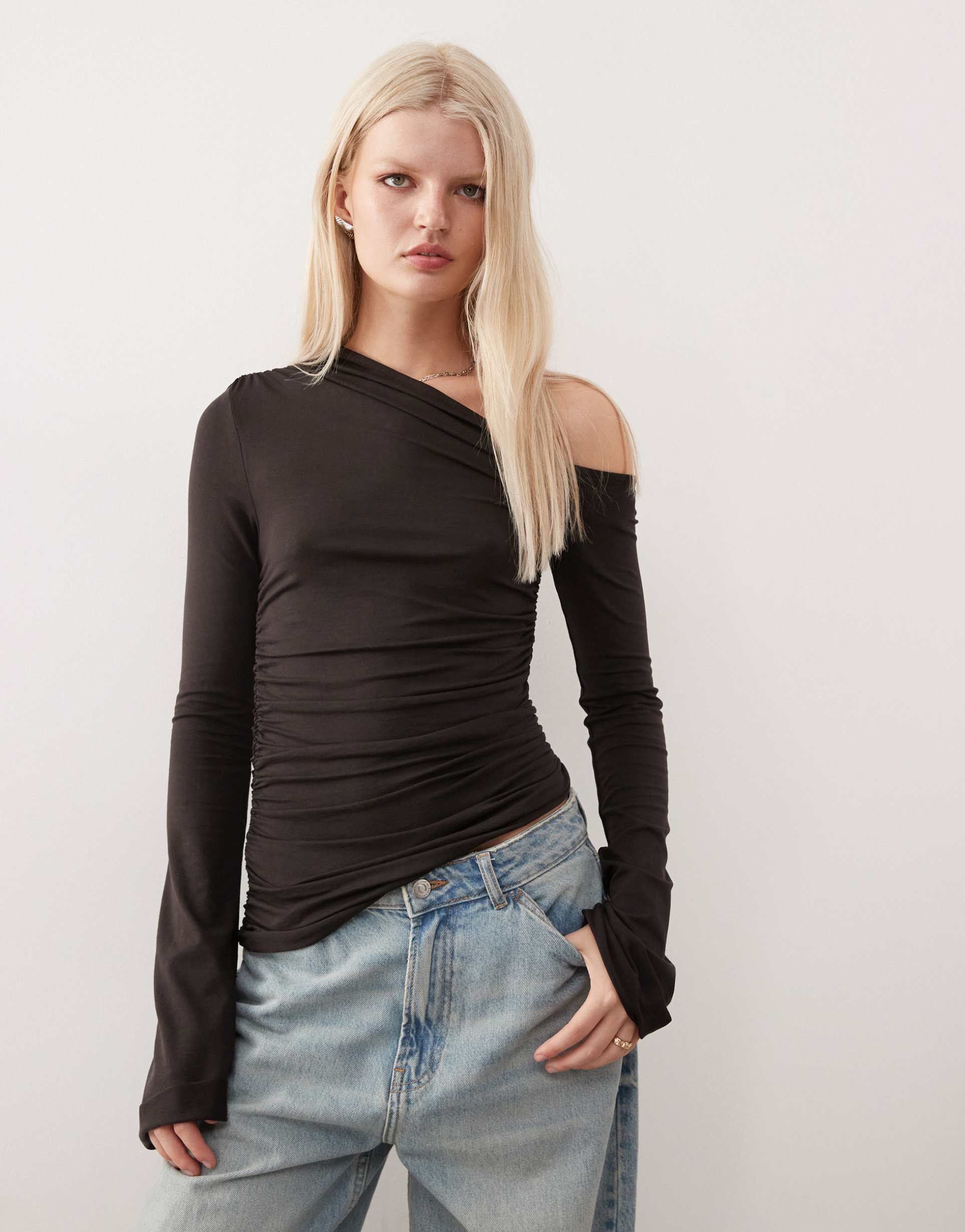 WEEKDAY ASYMMETRIC SHOULDER LONG SLEEVE TOP IN DARK BROWN