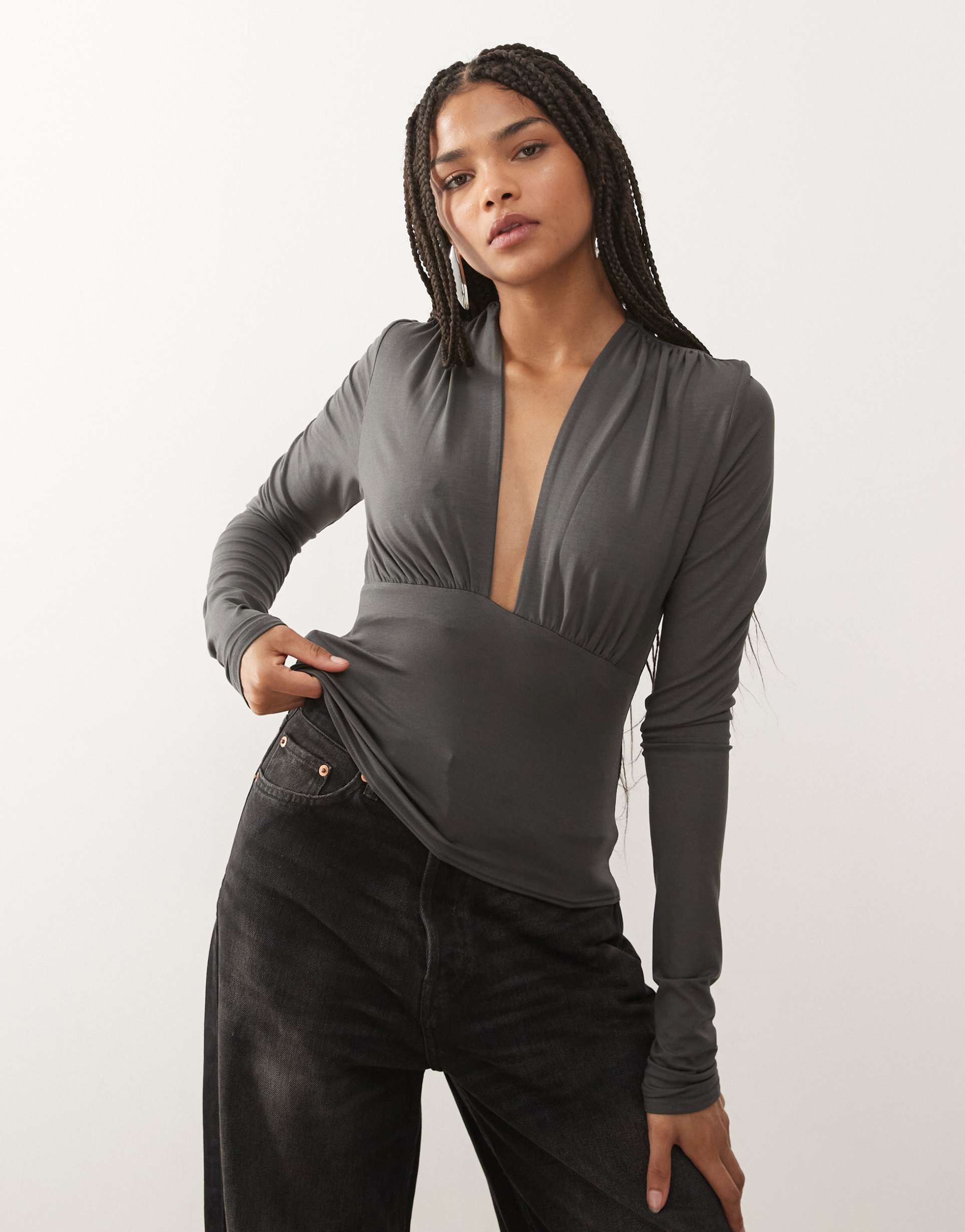 WEEKDAY DEEP HALTER NECK LONG SLEEVE TOP IN DARK GRAY - EXCLUSIVE TO ASOS