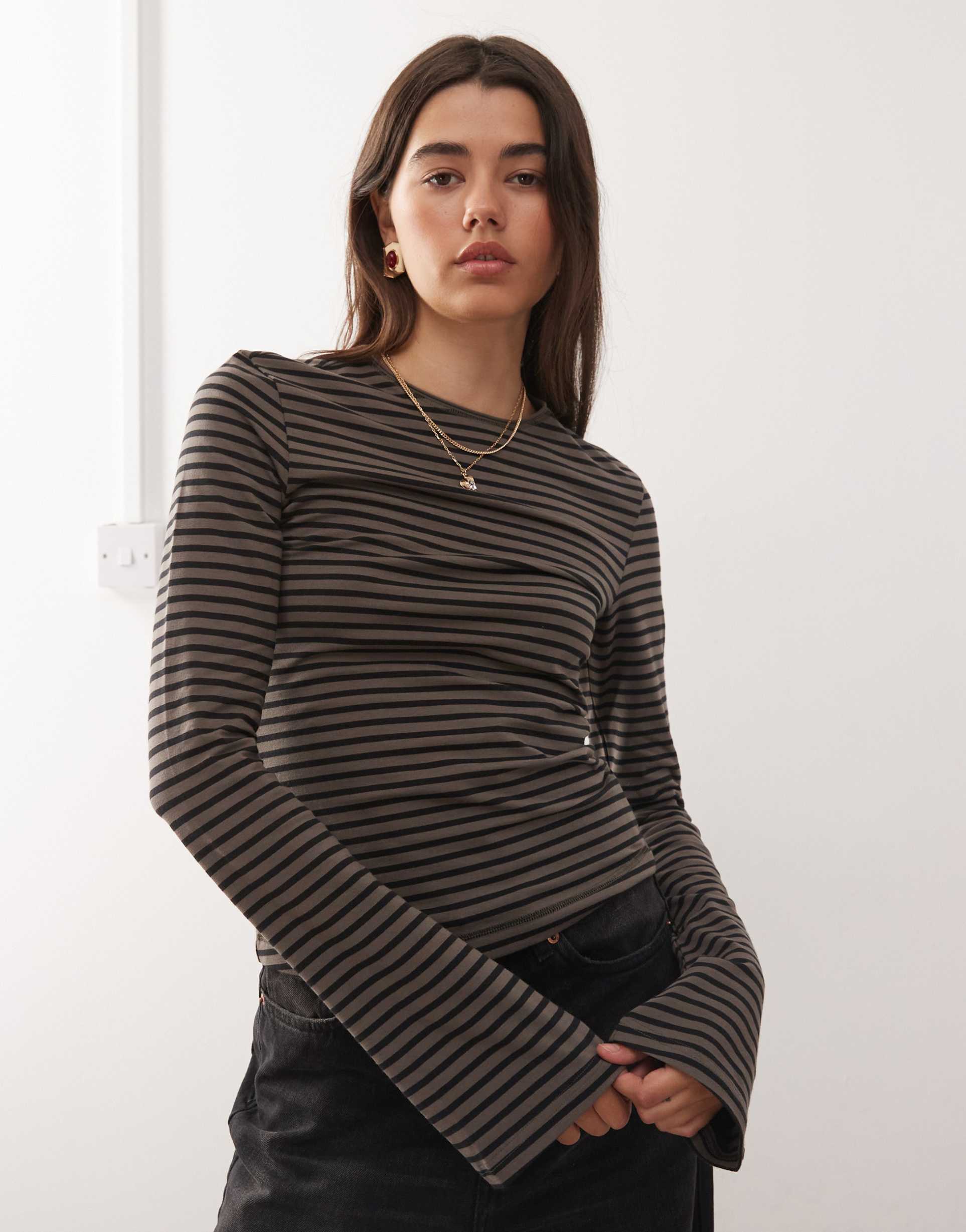 WEEKDAY FLARE LONG SLEEVE TOP IN DARK MOLE & BLACK STRIPES