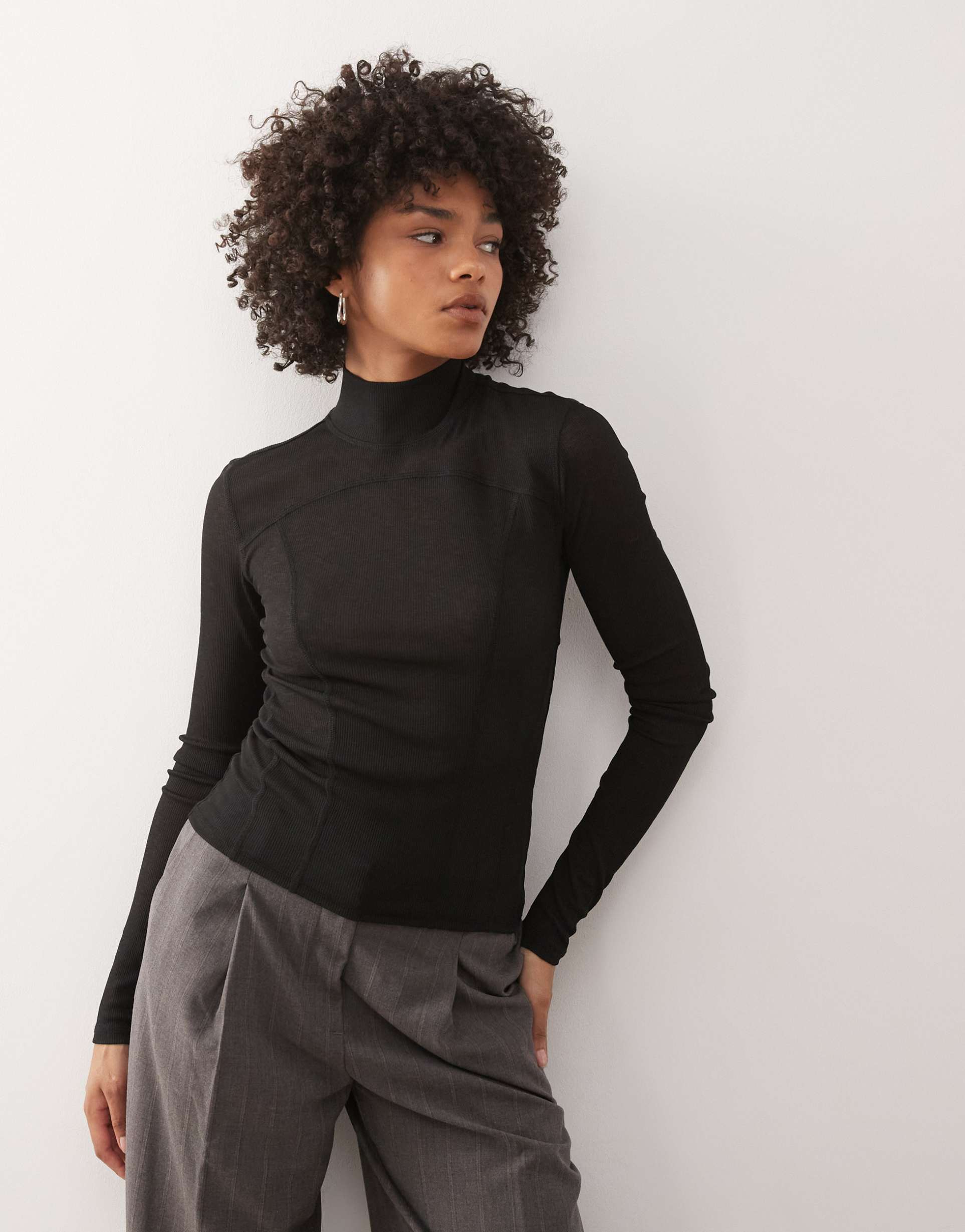 WEEKDAY MESH HIGH NECK LONG SLEEVE TOP WITH CONTOURED SEAM DETAILING IN BLACK