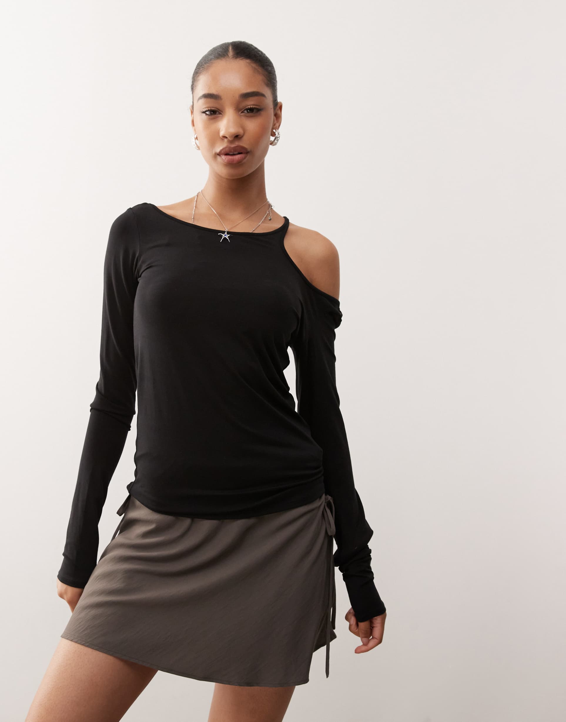 Soft and stretchy lyocell blend fabric sculpts this slim fit top featuring a chic off-shoulder neckline with a stylish cut-out detail on one shoulder. Long sleeves and a hip-length hem create a sleek silhouette perfect for layering or standalone wear. This minimalist black top offers versatile appeal, ideal for casual outings, everyday wear, and street style looks. Its understated design and comfortable fabric make it a reliable choice for transitional seasons like autumn, winter, and spring.