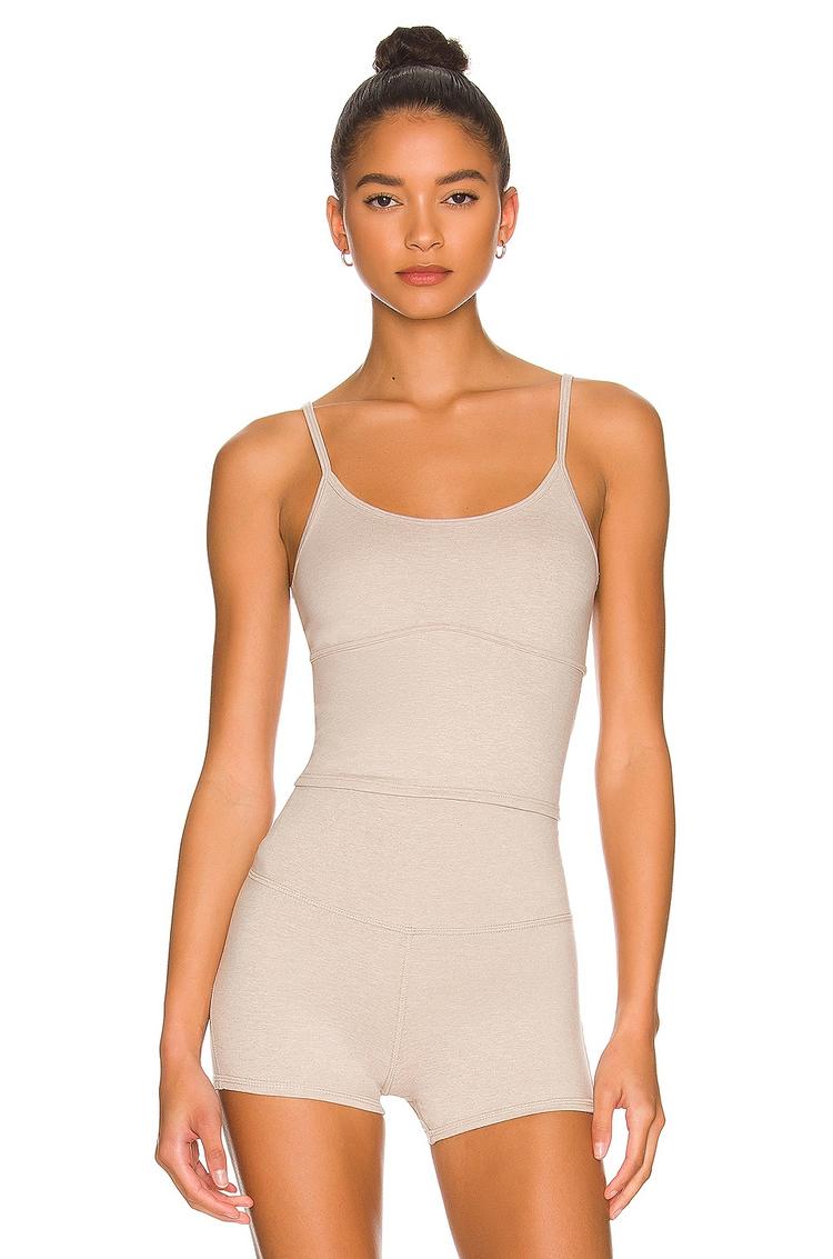 Soft heathered beige jersey fabric combined with a close fit and light compression creates the LoungeWell Ripley Tank, featuring a classic scoop neckline and delicate spaghetti straps. This sleeveless, waist-length tank offers 4-way stretch and sweat-wicking performance, making it ideal for everyday leisure, low-impact workouts, and casual errands. Its minimalist and casual chic design ensures versatility across seasons and occasions, providing comfortable support with a modern silhouette that pairs effortlessly with your active or loungewear wardrobe.