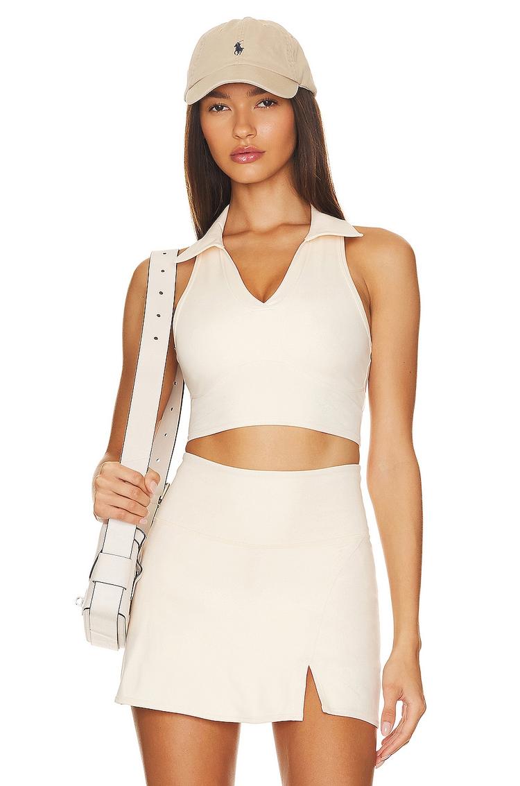 Clean lines and a sporty racerback define this fitted cropped tank crafted from a matte off-white recycled polyester blend with elastane for stretch and comfort. Featuring a flattering V-neck and sleeveless styling, its pullover design offers ease of wear. This versatile tank pairs seamlessly with high-waisted bottoms for casual outings, workout sessions, or athleisure looks, making it a stylish and sustainable choice for spring and summer wardrobes.