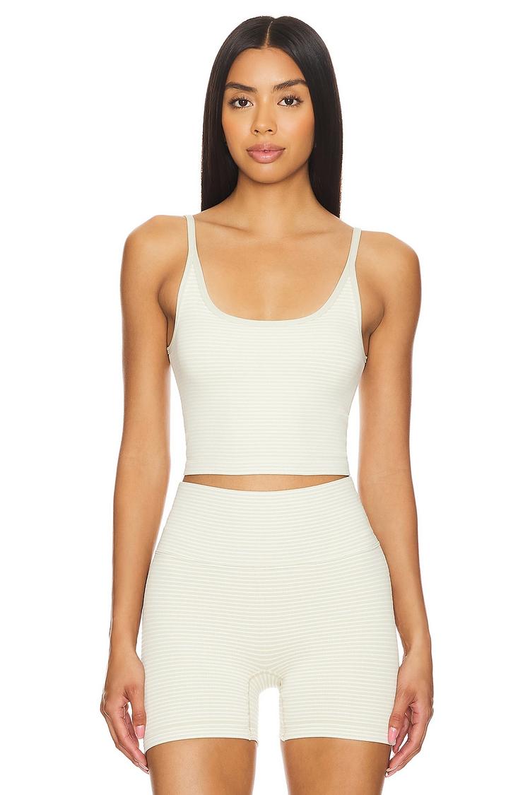 A sleek cropped tank crafted from ribbed polyester-nylon blend with elastane for stretch and comfort. Featuring adjustable spaghetti straps and a flattering U-neckline, this fitted tank emphasizes minimalism and casual chic style. Its off-white hue makes it versatile for spring and summer wear, perfect for casual outings, loungewear days, workout sessions, or travel. The covered back and cropped length add to its modern, clean silhouette, making it a staple piece for effortless layering or standalone wear.